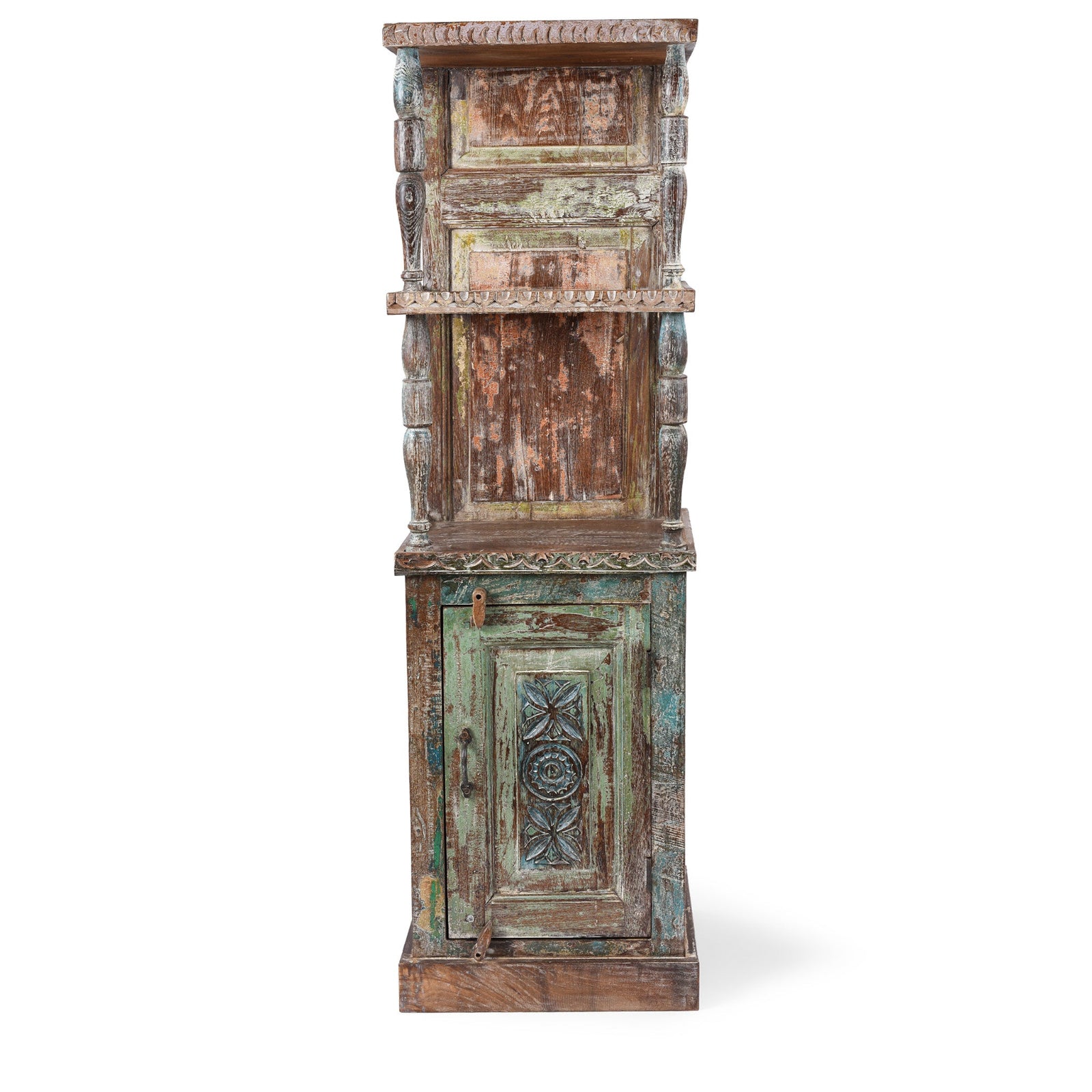 This rustic Indian shelf is made from reclaimed teak wood salvaged from old buildings in Rajasthan and Gujarat. The green painted door is salvaged from an old cabinet. This is an incredibly functional piece of furniture, decorative, extremely durable and environmentally friendly.