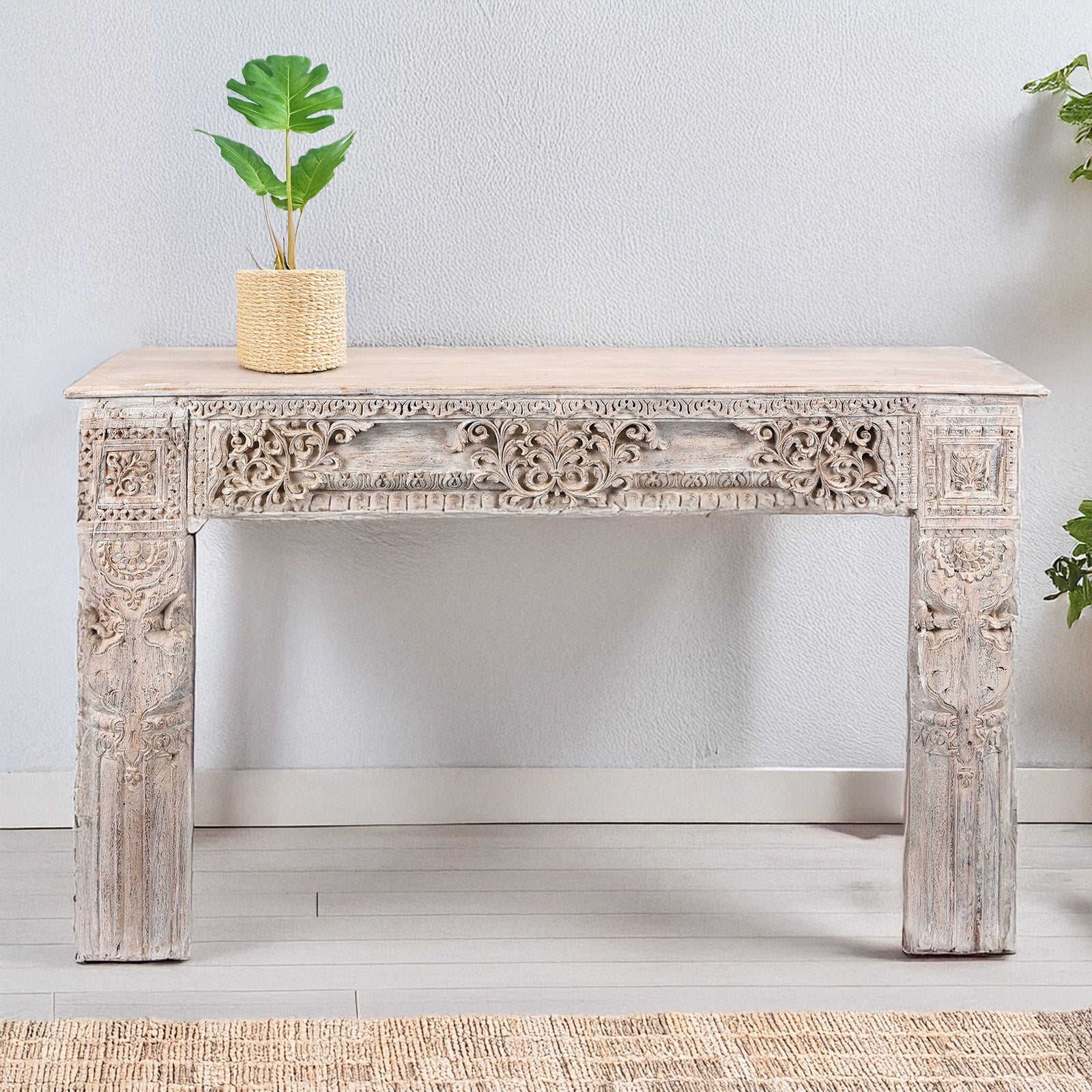 Carving Detail From Reclaimed Teakwood Console Table With Painted Finish | Indigo Antiques
