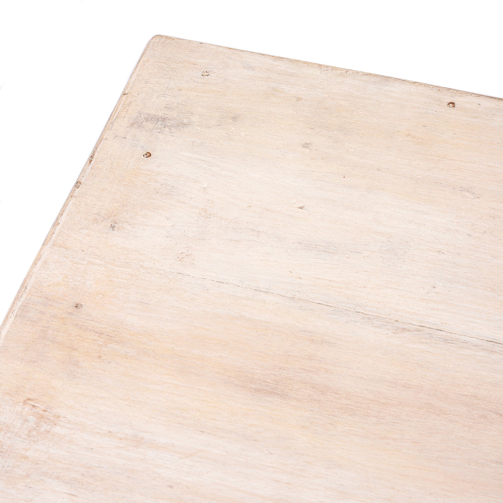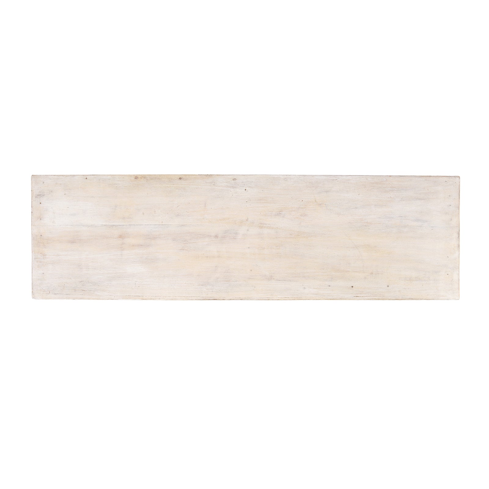 This Indian console table is made from reclaimed wood salvaged from old buildings in Rajasthan and Gujarat. It is decorative, extremely durable, and environmentally friendly. This piece is adorned with panels made from a compilation of architectural pieces. Its distinctive carvings add considerable appeal, finished with a charming lime wash.