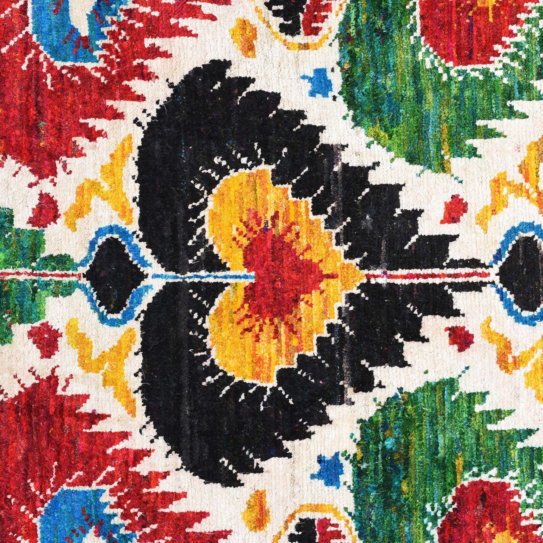 This stunning silk rug is created from recycled Sari silk so it's environmentally friendly. The rug takes inspiration from classic Persian designs but has a vibrant modern look and complex colours which weren't available to traditional carpet weavers.