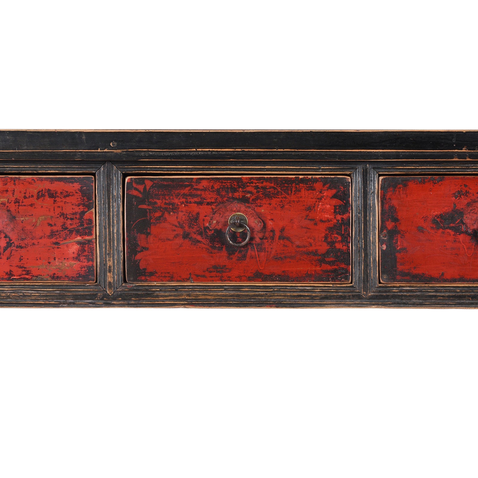 This provincial Chinese altar table dates from the 19th century, Qing dynasty (1644-1911). It is from Gansu province in Northern China and is made from pear wood. It has five red painted drawers set within a black frame. It would be perfect in a hallway given its shallow depth. Pear wood (梨木 lí mù) is considered a luxurious wood in Northern China.