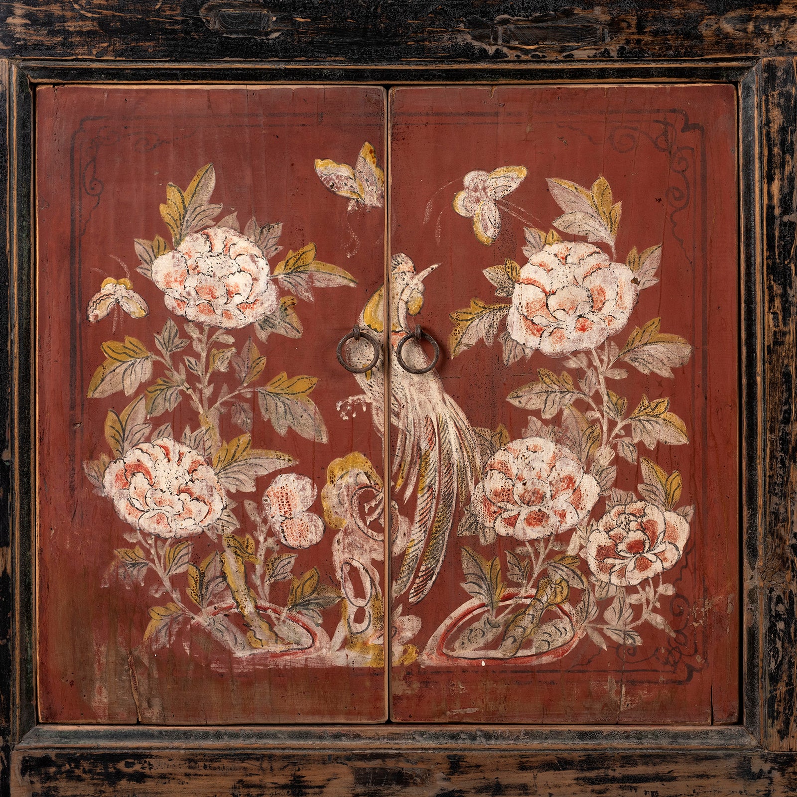 Wildfowl Detail From Painted Doors On Antique Red & Black Painted Sideboard From Shanxi  | Indigo Antiques