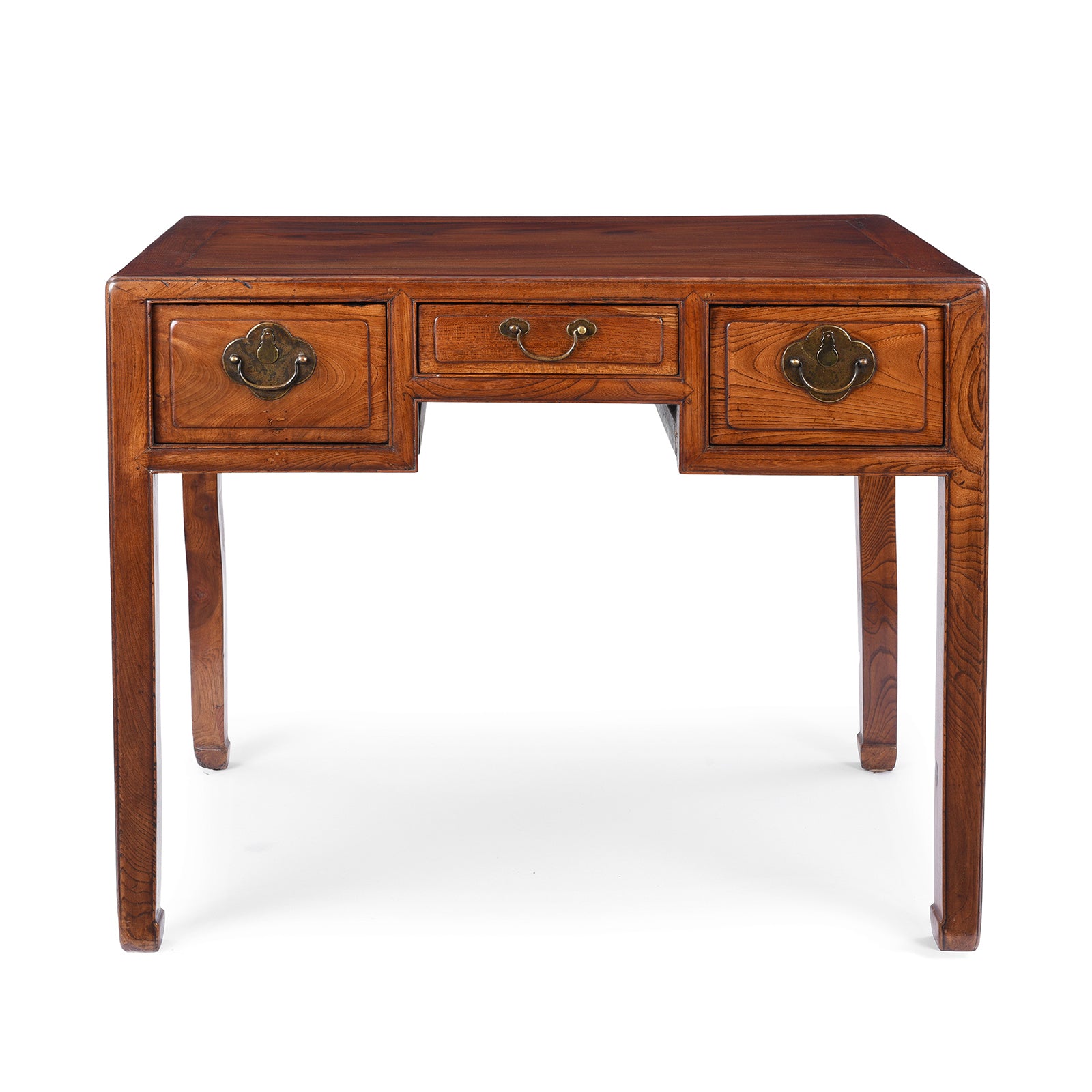 This style of kneehole desk may well have been influenced by Western traders. It has three drawers making it more functional than much traditional Chinese antique furniture. The brass is original and has beautifully detailed double gourd shaped key covers.