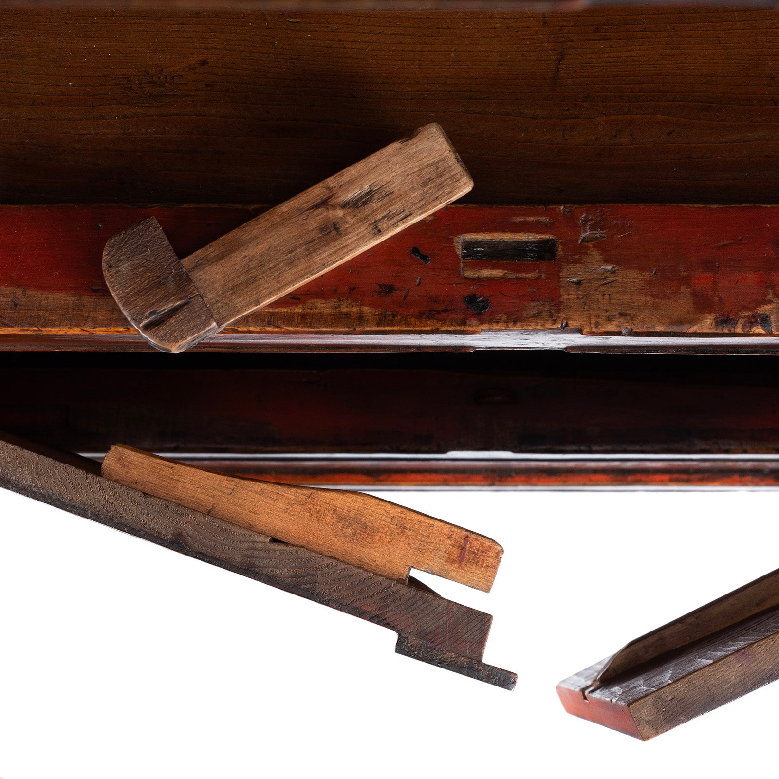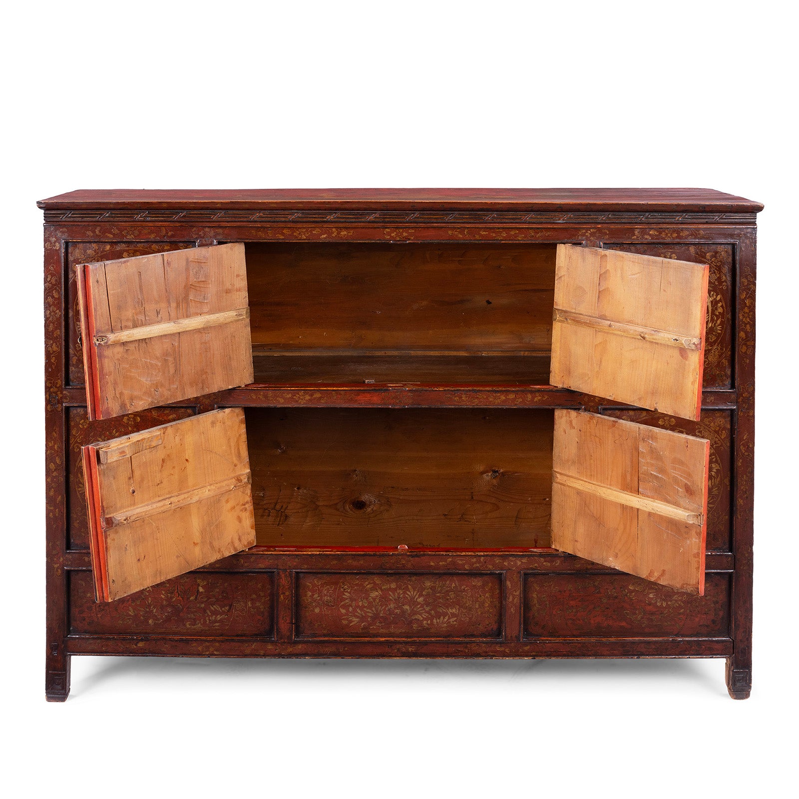 The cabinet opens through four hinged doors, with the upper pair retaining original incised brass hardware. The lower doors are secured by a traditional secret locking peg accessed through the top compartment, a secure Tibetan mechanism used to protect ritual objects. Inside are two substantial storage chambers. The structure stands on square scroll feet, giving the cabinet both stability and sculptural presence. With its gilt dragons and phoenixes and richly preserved surface, it functions as a powerful decorative and cultural focal point.