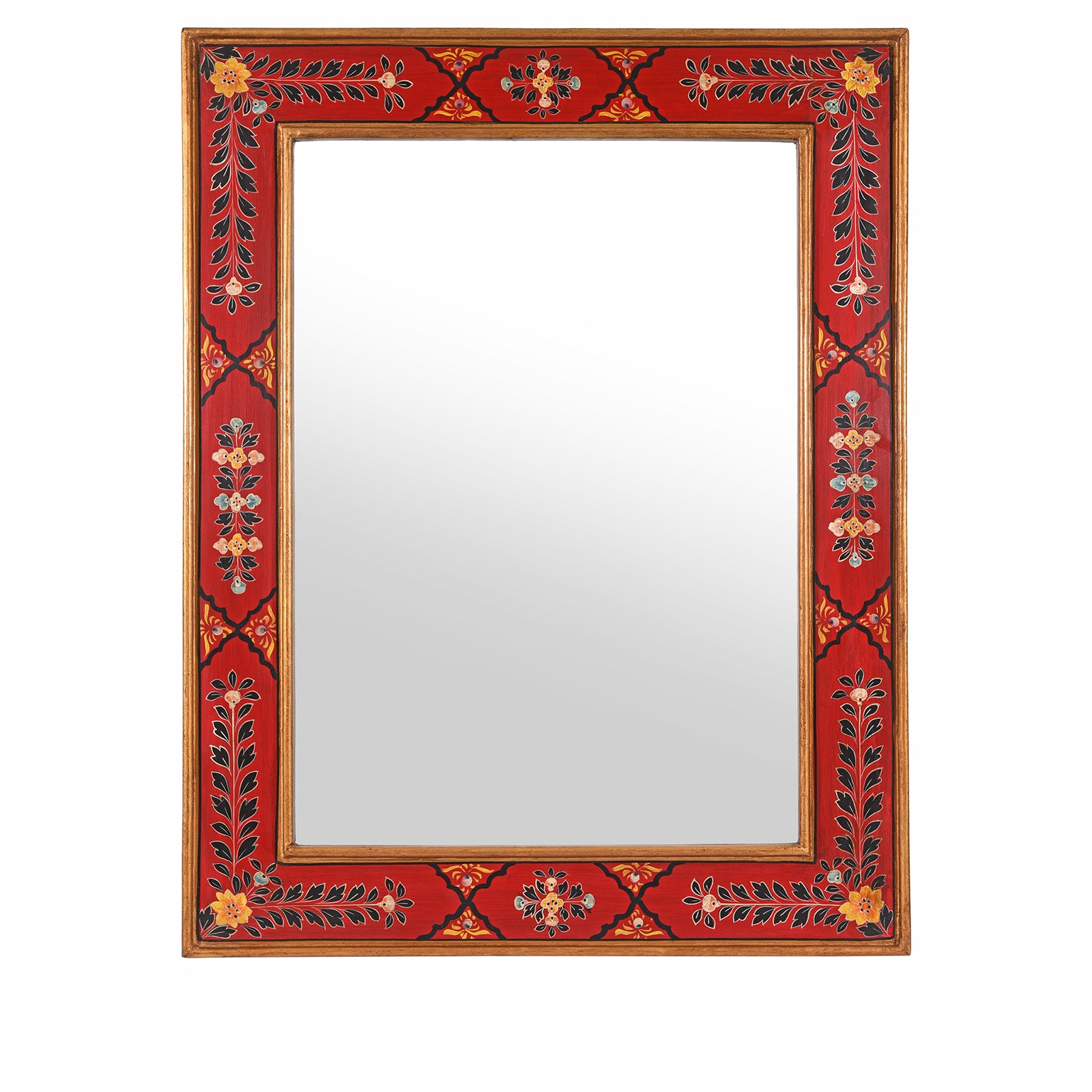 This hand painted Indian mirror is decorated in a rich Rajasthani red tone and is a playful addition to any home eliciting memories from your India travels. Crafted from wood and thoughtfully designed to add an elegant touch to your space, this mirror blends traditional Rajasthani and Mughal designs. Elevate the décor of your living room or bathroom with this exclusive mirror.