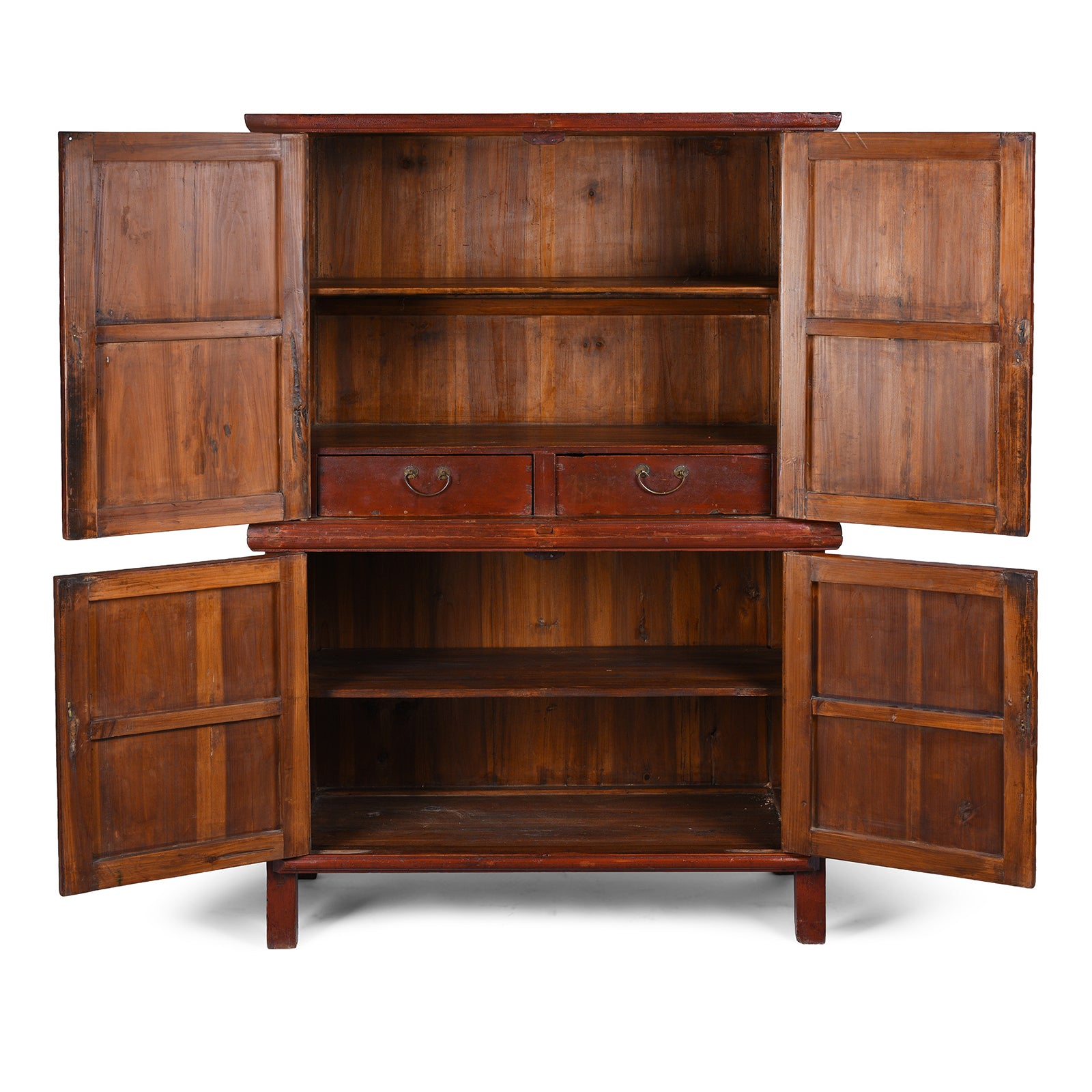 A richly patinated, two-part bridal cabinet from Zhejiang, South China, finished in deep cinnabar-red lacquer. Presented as part of a bride’s dowry, wedding cabinets like this balanced generous storage with layers of auspicious meaning—the glowing red surface signalling joy, prosperity and enduring good fortune for the new household.