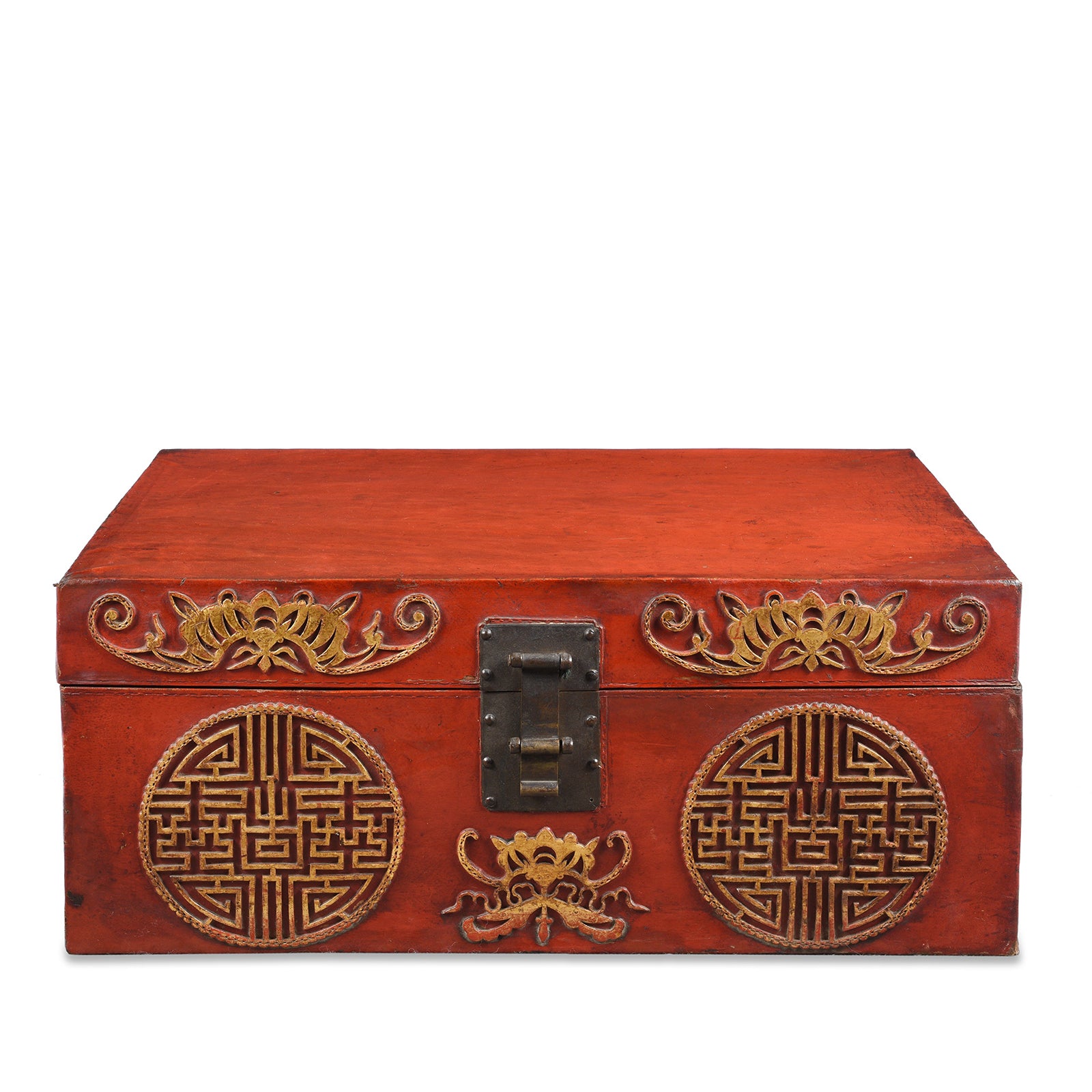 This Chinese red leather trunk dates to the end of the Qing dynasty (1644 - 1911). Chinese leather trunks have been used for many hundreds of years with the classic style changing very little. This parcel gilt work style appeared at the end of the 19th century. These chests were made for traveling and storage of clothing they are robust and work well in a contemporary western space as a coffee table, or for storage.