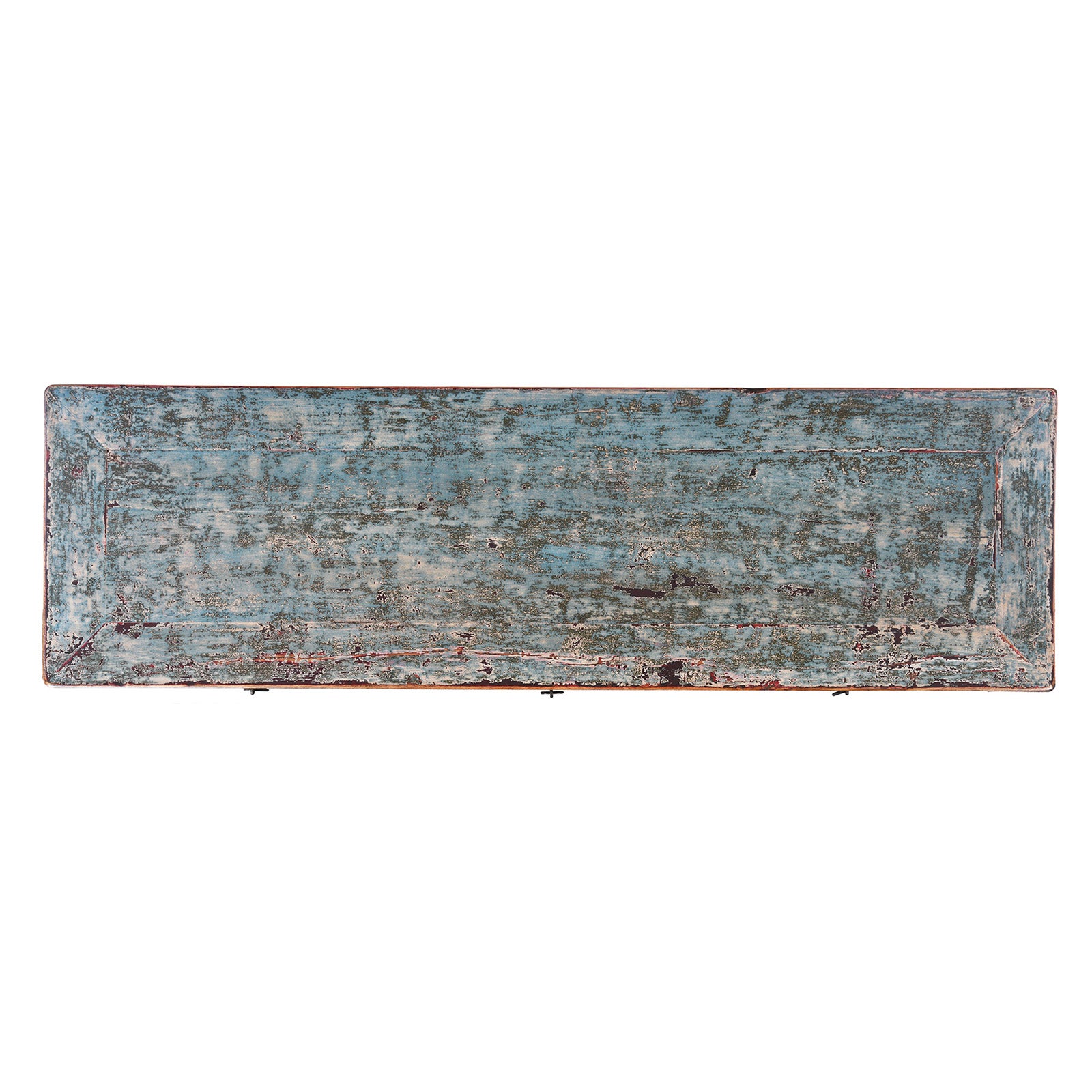 This turquoise lacquered console table is not antique but it is made from reclaimed wood from old doors. With three drawers, this would look great in a hallway or living room.