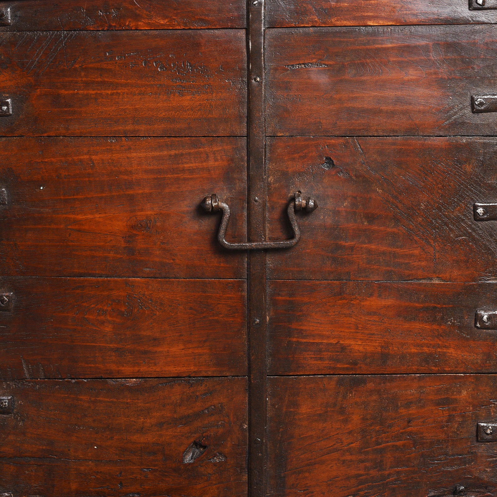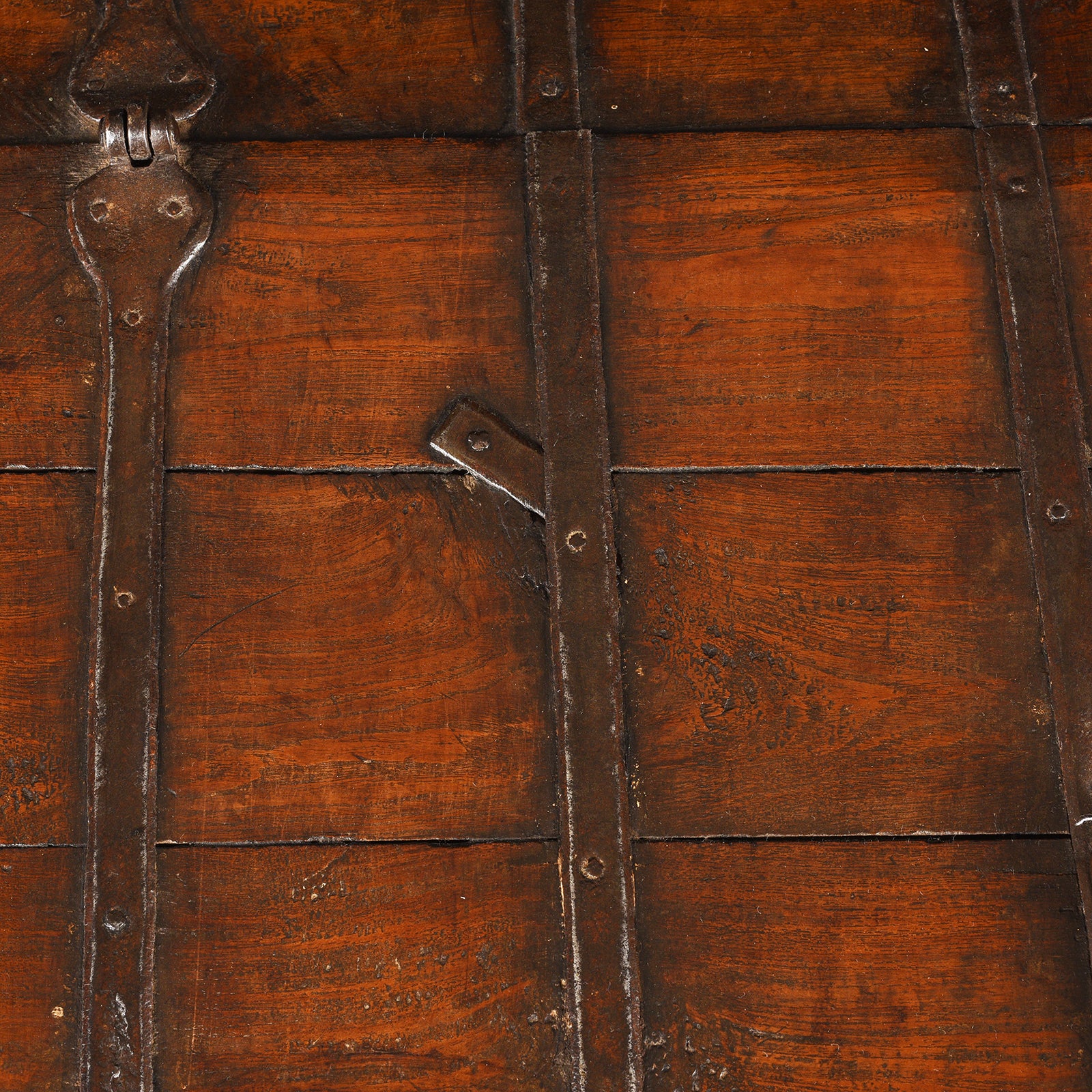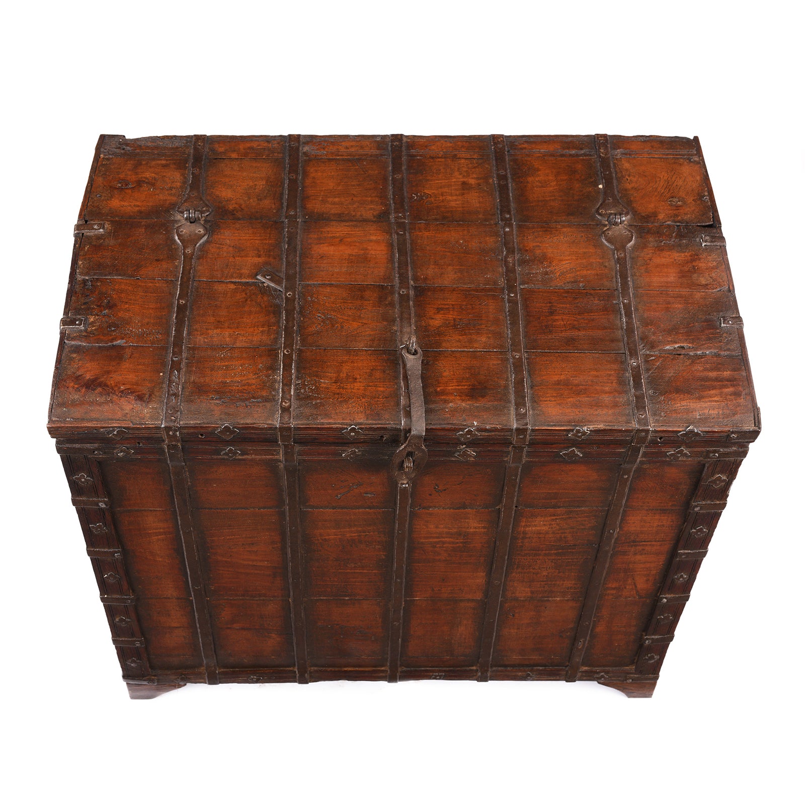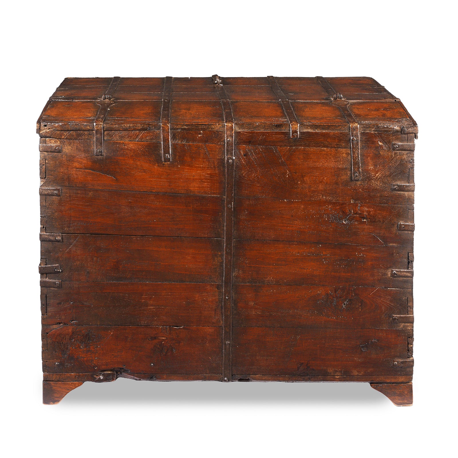 It is constructed from beautifully patinated teak and has its original iron fittings and handles. The interior consists of one large space and a fitted candle box.