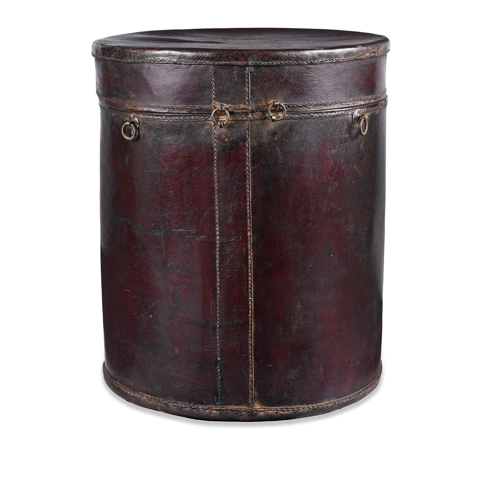 This beautiful old leather hat box was made for the storage of Chinese officials hats or storage of Chinese hats that were used for special occasions. They have an old brass lock and are constructed from burgundy lacquered leather.
