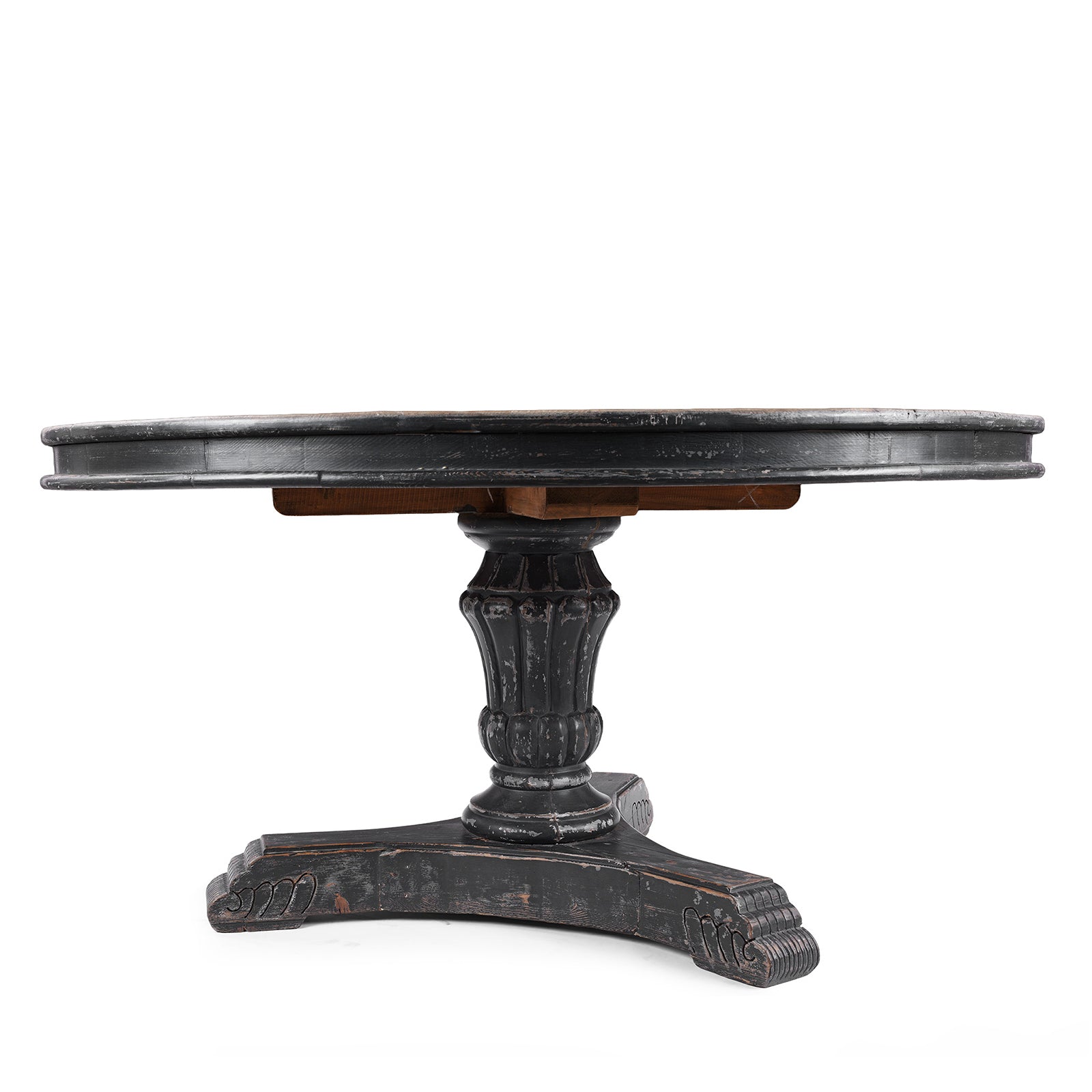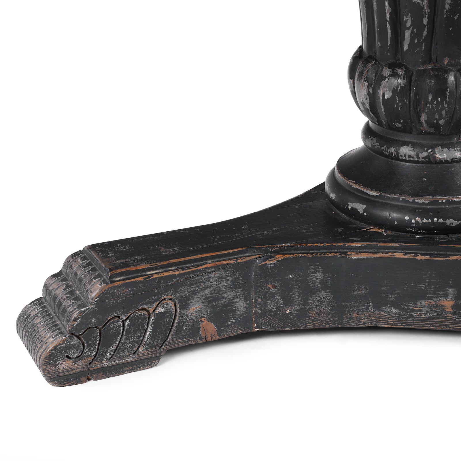 Base Detail From Round Pedestal Dining Table With Reclaimed Pine Top And Distressed Black Painted Base