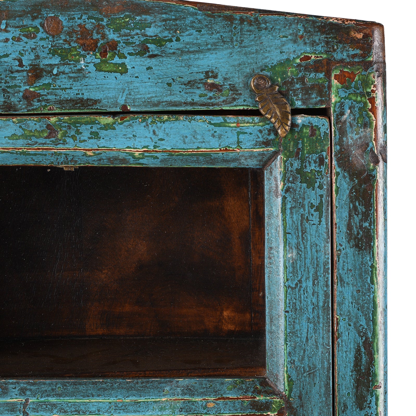 - Features: Blue painted finish with natural wear, glazed door, two interior shelves