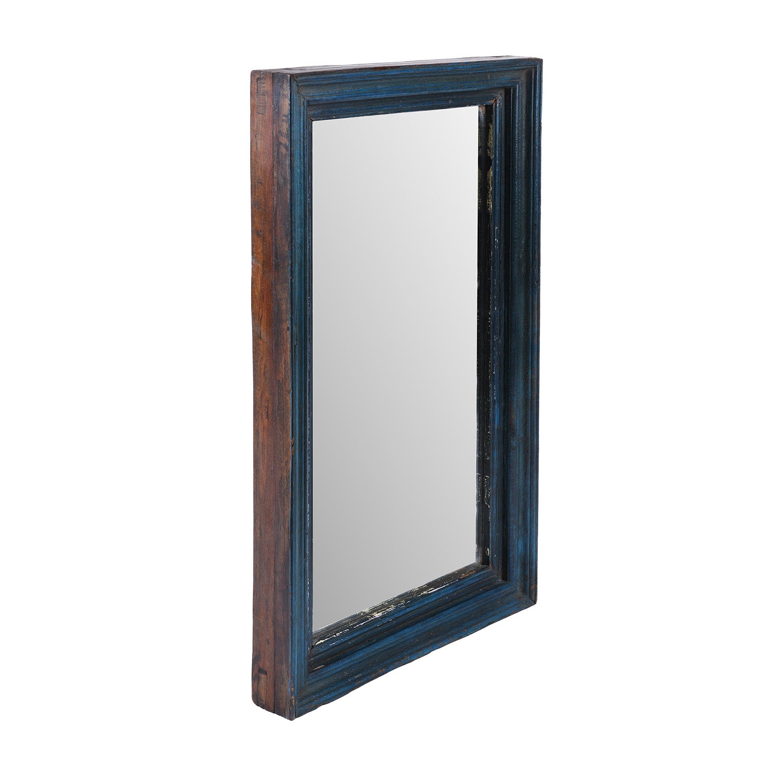 This simple yet striking mirror is crafted from reclaimed teak taken from an old 19th-century building in Gujarat. Its deep frame retains traces of original blue paintwork, creating a beautifully worn, time-layered surface that reflects generations of use. The subtle moulding lines give the frame a clean, architectural look, making it an easy piece to incorporate into both contemporary and rustic interiors.