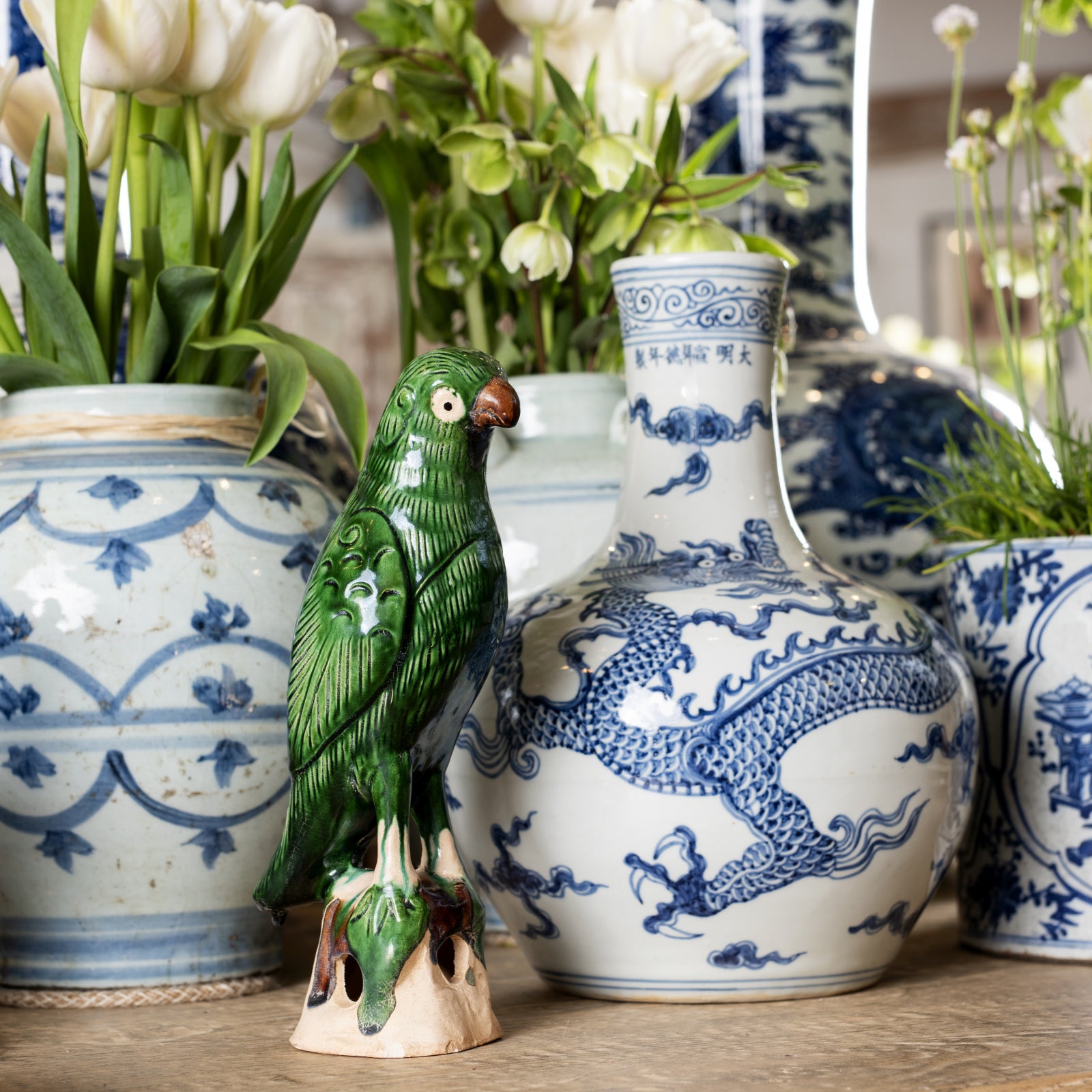 Sancai, meaning “three colours” in Chinese, refers to a glazing tradition that developed in China during the Tang dynasty, characterised by the flowing interaction of coloured glazes across the surface. In this contemporary interpretation, the sancai glaze allows tones of green, blue, and natural earth colours to merge and pool organically, ensuring that each parrot displays subtle variations in colour and finish.
