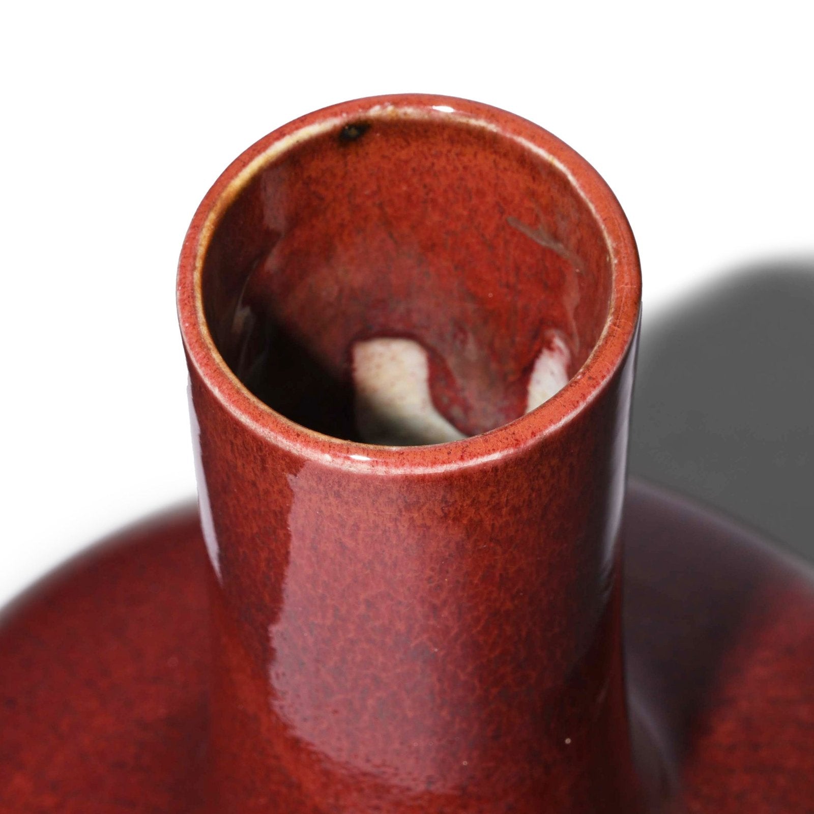 Red flambe was first developed in the 11th century and is created by mixing iron & copper. Flambe glazes were notoriously difficult and unpredictable to work with but highly decorative with varying effects. Developed in the Jingdezhen porcelain kilns during the Kangxi reign (1662-1722).