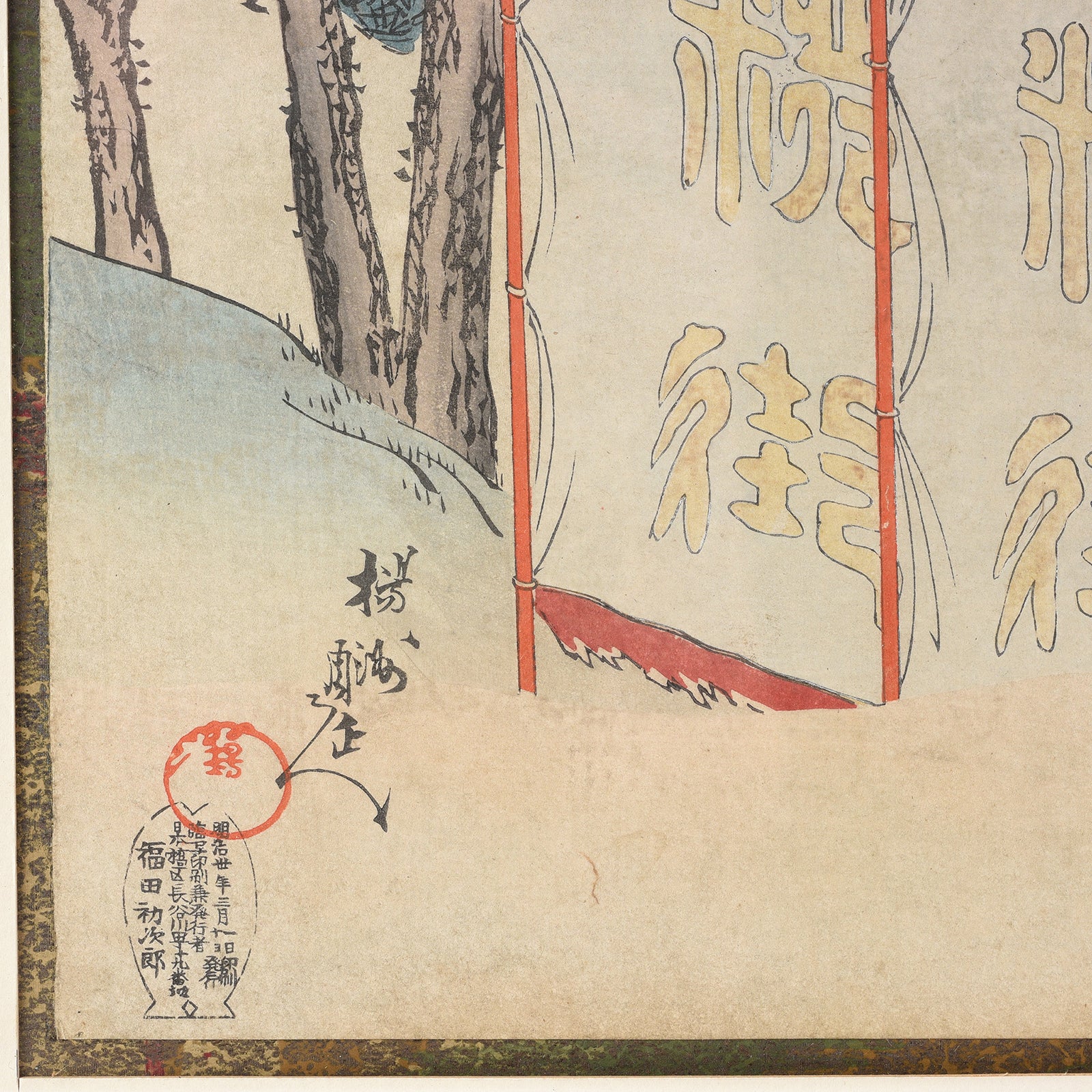 This old Japanese woodblock triptych is by Meiji era woodblock print artist Toyohara Chikanobu (1838 - 1912). This woodblock is entitled "Chiyoda no on-omote: Sanno sairei joran' (Chiyoda Outer Palace: Viewing the Sanno Festival) and depicts the Sanno Matsuri festival in 1897, a biennial festival celebrated in June with a procession from Sanno shrine in Tokyo, near Akasaka to the Hie-jinja shrine at Edo Castle.