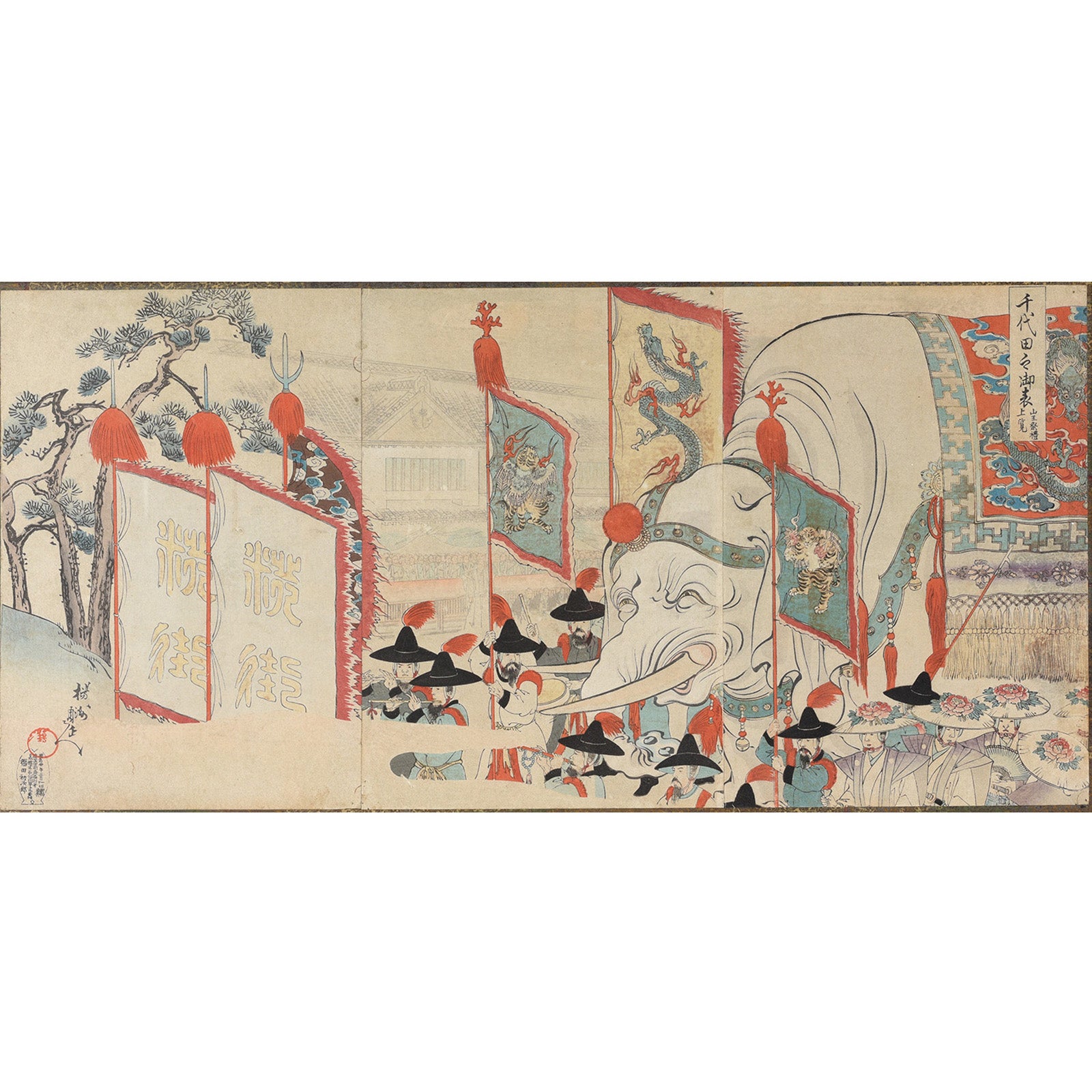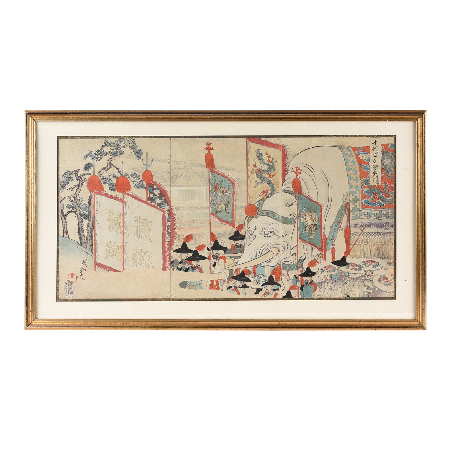 Every part of this triptych flows with movement - the elephant rolls into the frame and the fabric of the elephant and flags flutter with a light breeze. Woodblock prints like these capture historic moments that were otherwise lost and hold both an artistic value & an anthropological one showing the relationships between Japan, Korea & China.