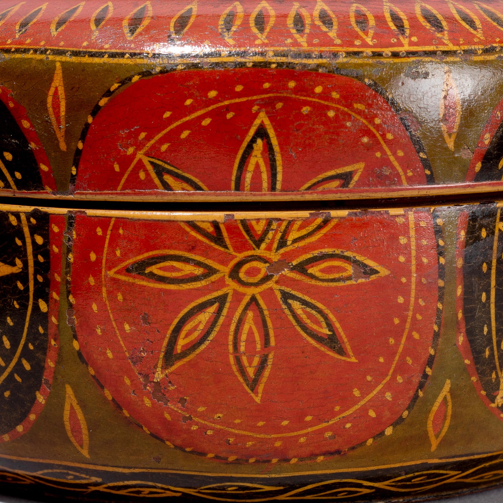 Each pot was hand-turned on a simple lathe, with coloured sticks of lac applied by friction to deposit a thin layer of glowing colour. The deep reds, blacks, and ochres of this piece remain wonderfully vibrant despite its age, and the surface has acquired a soft, timeworn sheen that enhances its folk-art charm.