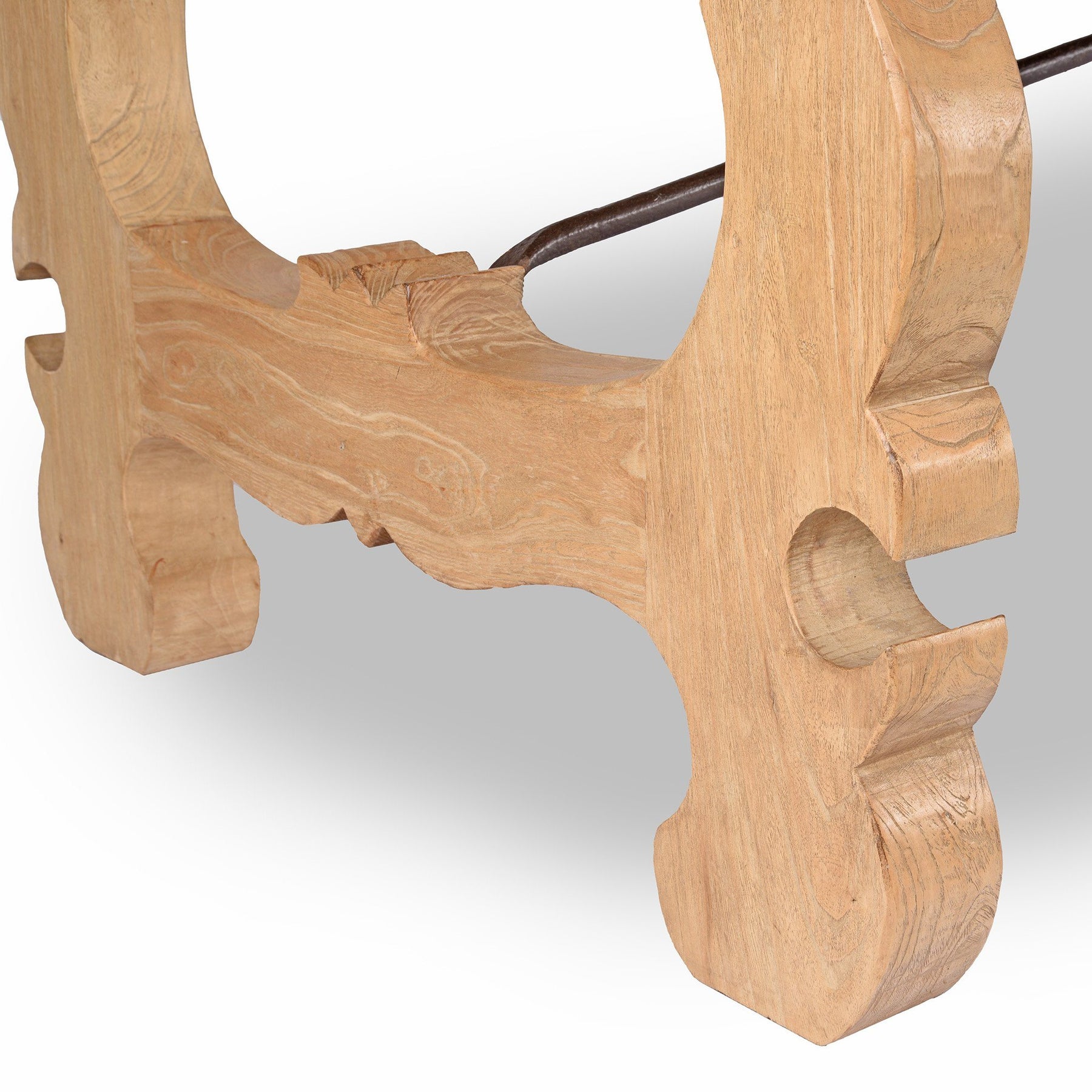 Every table is unique with old repairs, butterfly joints & remnants of old ironware. Its elegant scroll base and iron tie add a sense of majesty. Enjoy dining in style with this timeless design.
