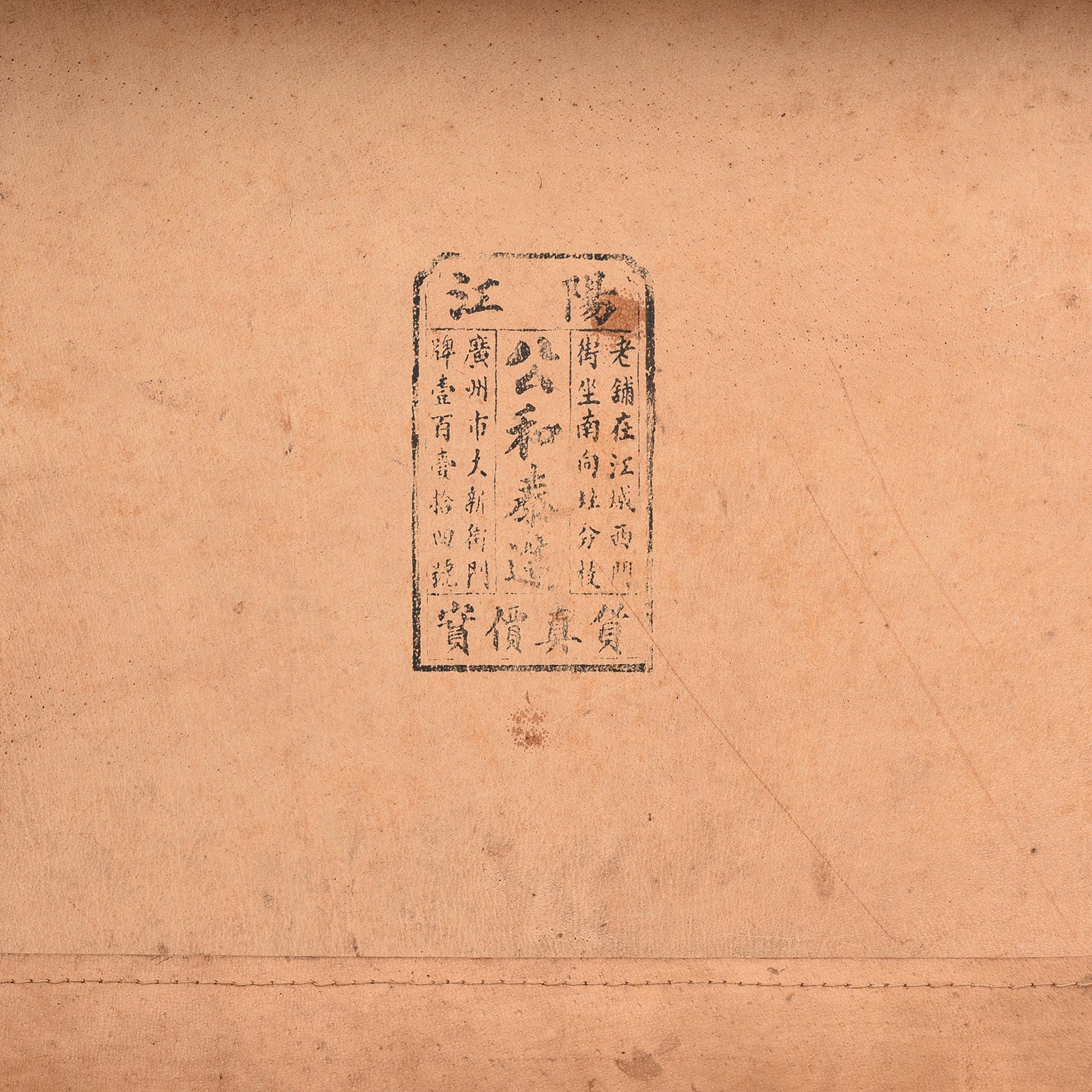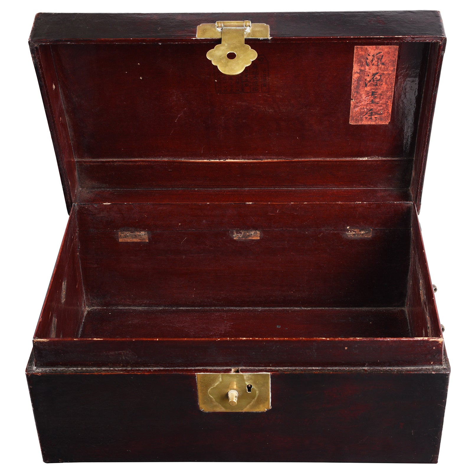 These three Chinese leather-covered trunks were originally made for the storage and transport of clothing and valuables, travelling through merchant networks that linked Jiangxi workshops with the commercial districts of Guangzhou. One trunk (medium) retains its original brass hardware and is stamped with a merchant stamp; Gong He Tai. The stamp reads: “Our old shop is located on Yang Street in Jiangxi, facing south, distributing goods. Gong He Tai shop; Guangzhou City, Daxin Street, Chen Zhan General Goods Shop, No. 4, Bao Goods / Precious Goods”. They were a established supplier which helps confirm their late Qing to early Republican date and southern Chinese origin. The small box has an added red label with blessings; 源源 (“continually, in an unending stream”) & 生余 (“produce surplus”, “generate plenty”).