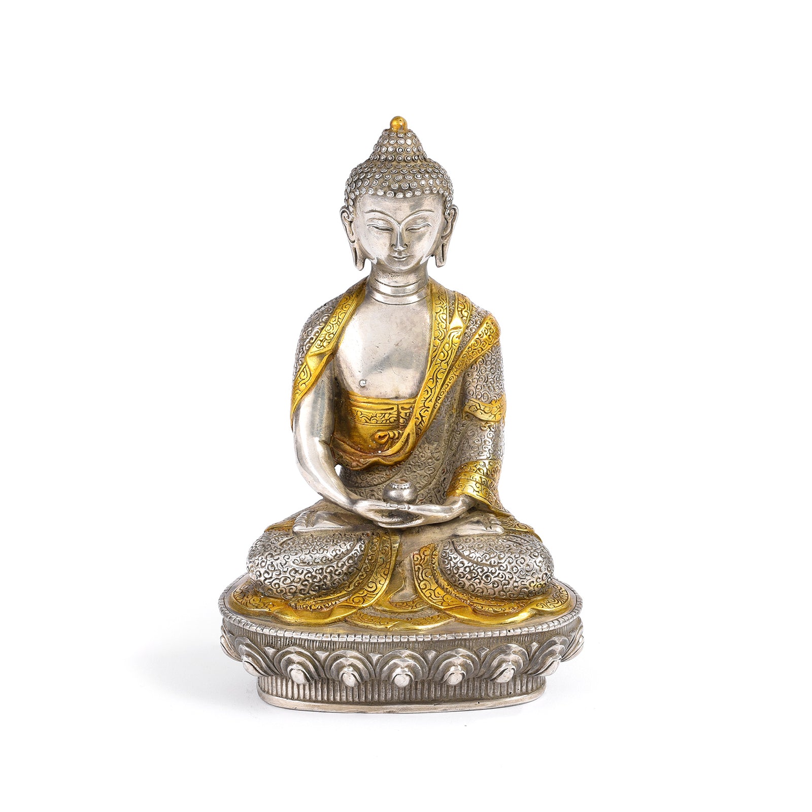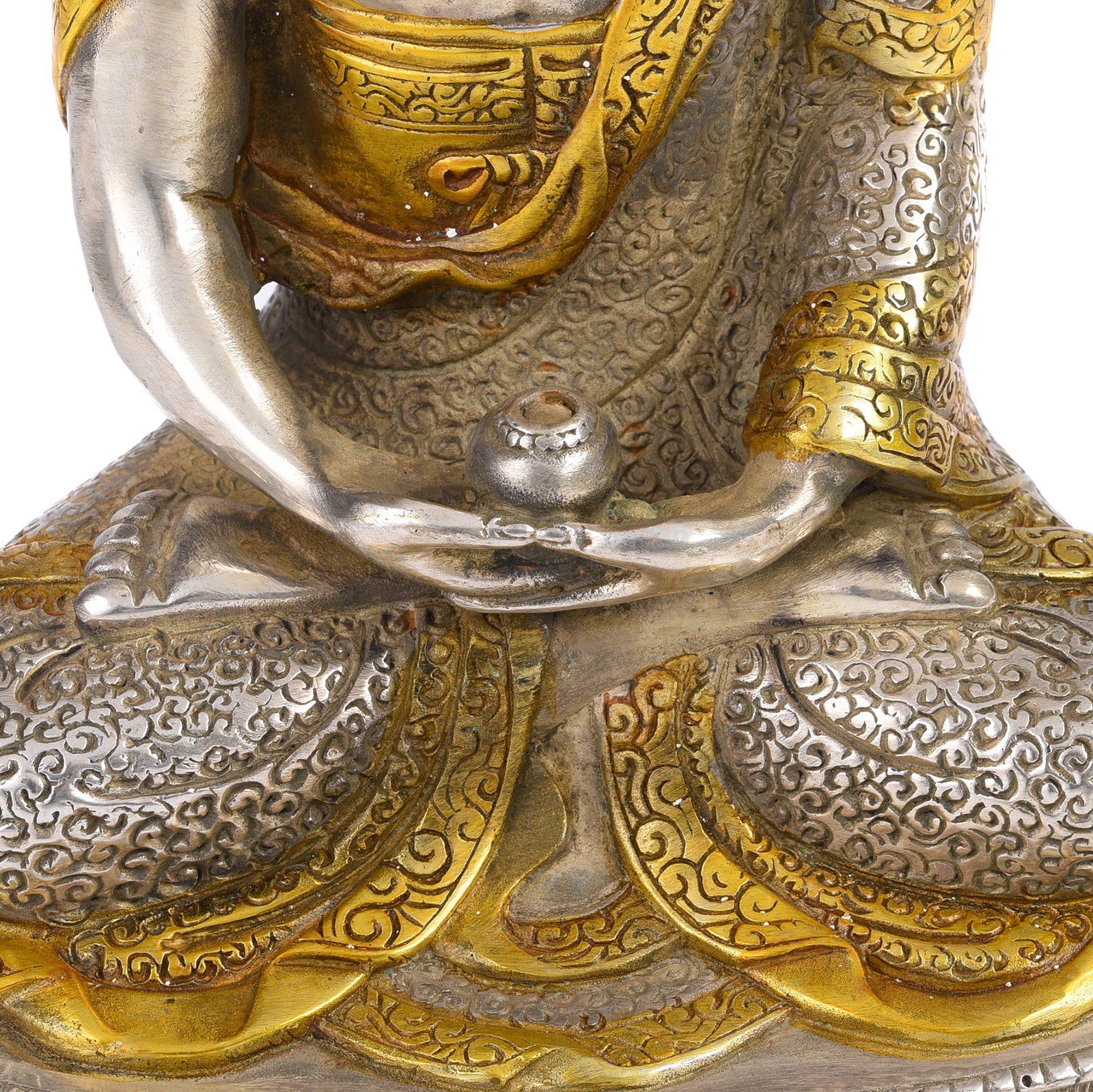 This silver plated brass Buddha statue is in the pose of dhyana mudra, the meditation pose. Dhyana was used by Buddha during his final meditation beneath the Bodhi tree before achieving enlightenment. His hands rest on his lap, right hand leaning on the palm of the left holding an alms bowl.