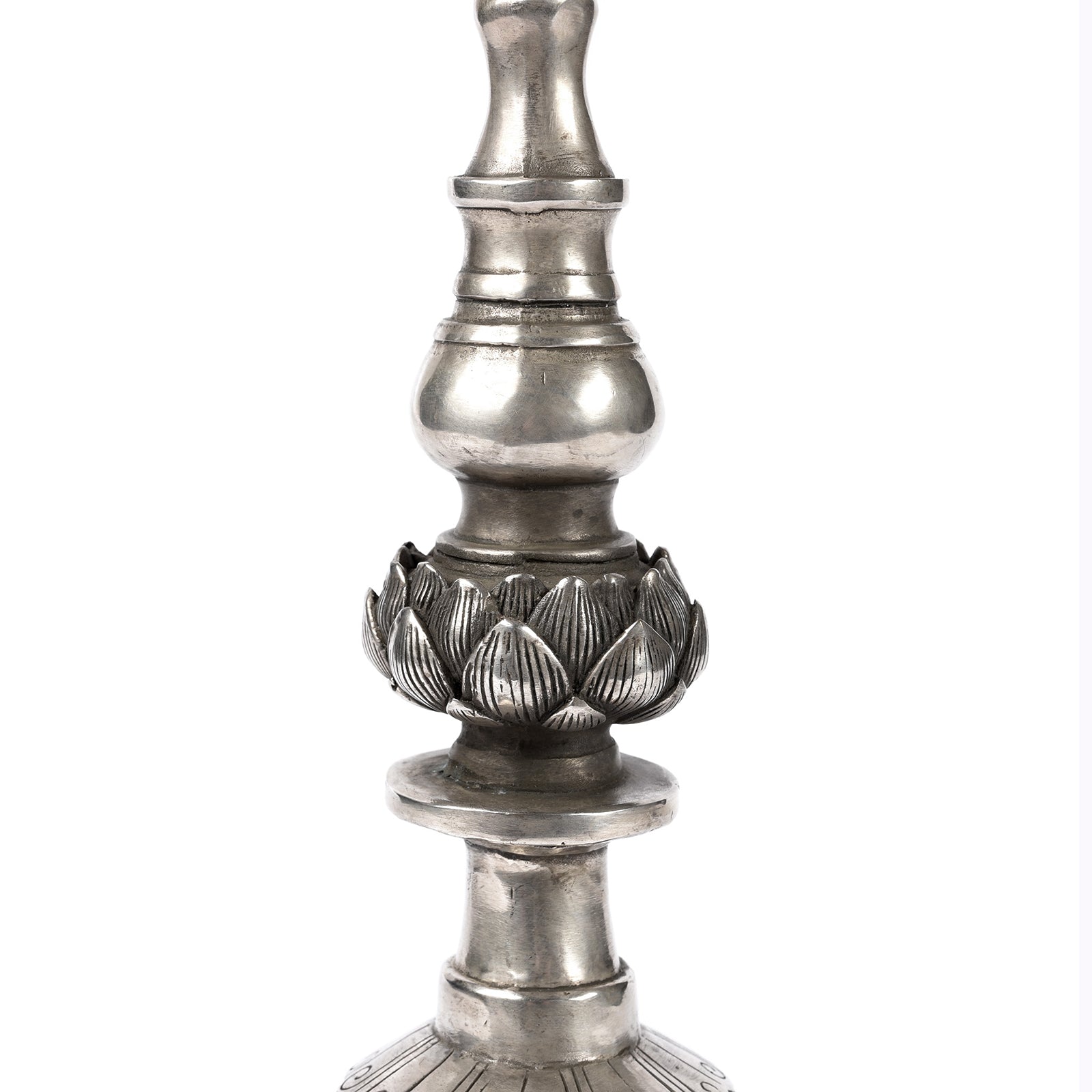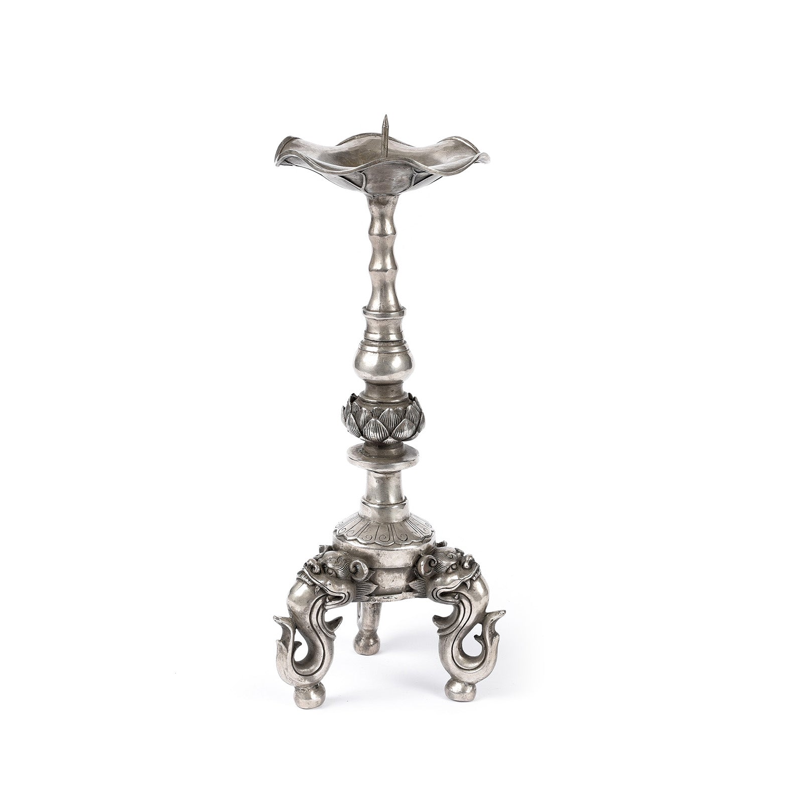 This fabulous candlestick is a museum quality reproduction of the Tibetan style. The base has stylised makara heads. Makara has the trunk of an elephant, the jaw of a crocodile, the tusks of a boar, and the feet of a lion. It is the tenth sign of the Indian zodiac corresponding to Capricorn.
