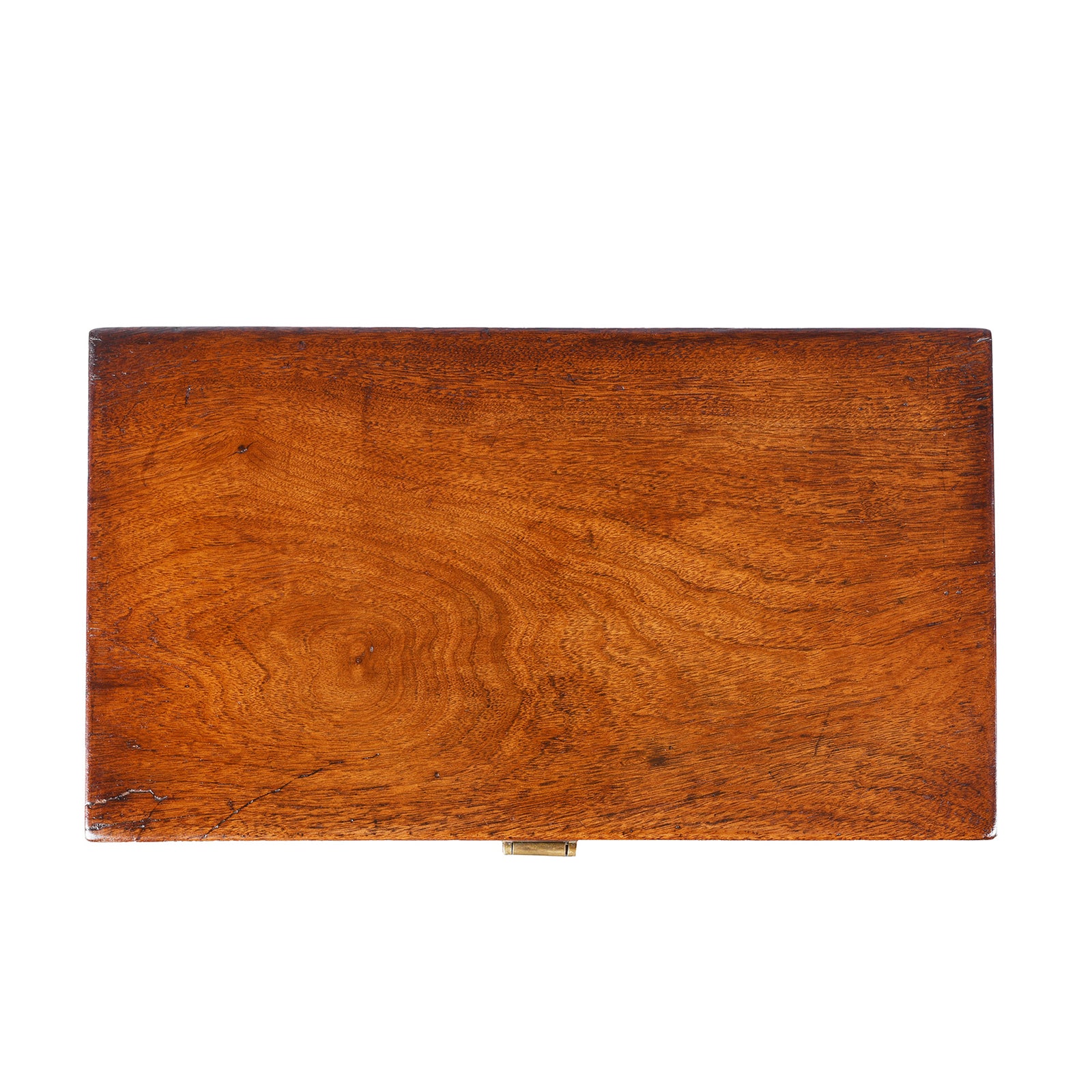 Most of the brass fittings are original, the front lock plate has been replaced with another old brass plate. This box can be particularly prized for its one piece top.