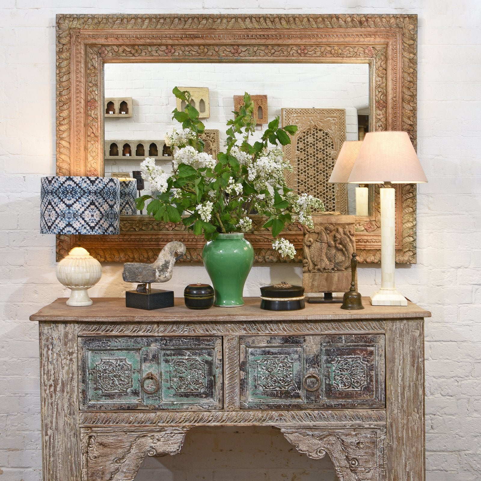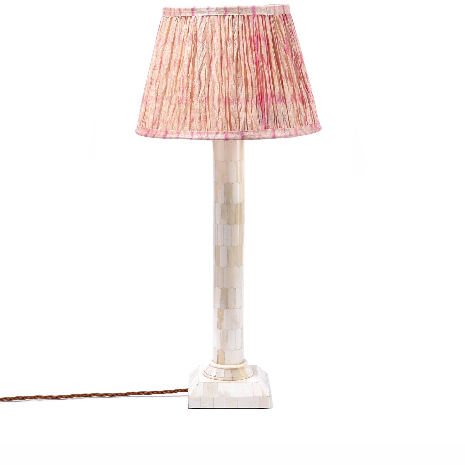 Inspired by the classic Mughal style, our tall bone inlay table lamp bases are expertly handmade in Rajasthan, India in small workshops. The bone inlay is done by hand and then carved. Each piece is unique.