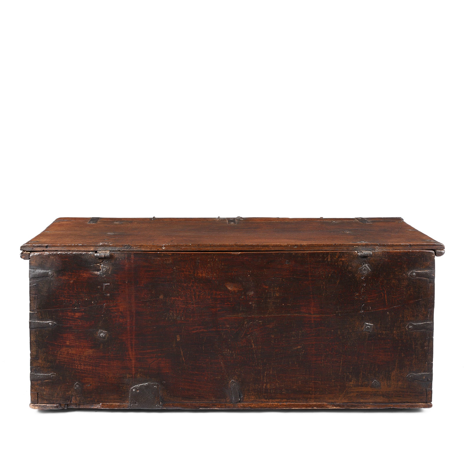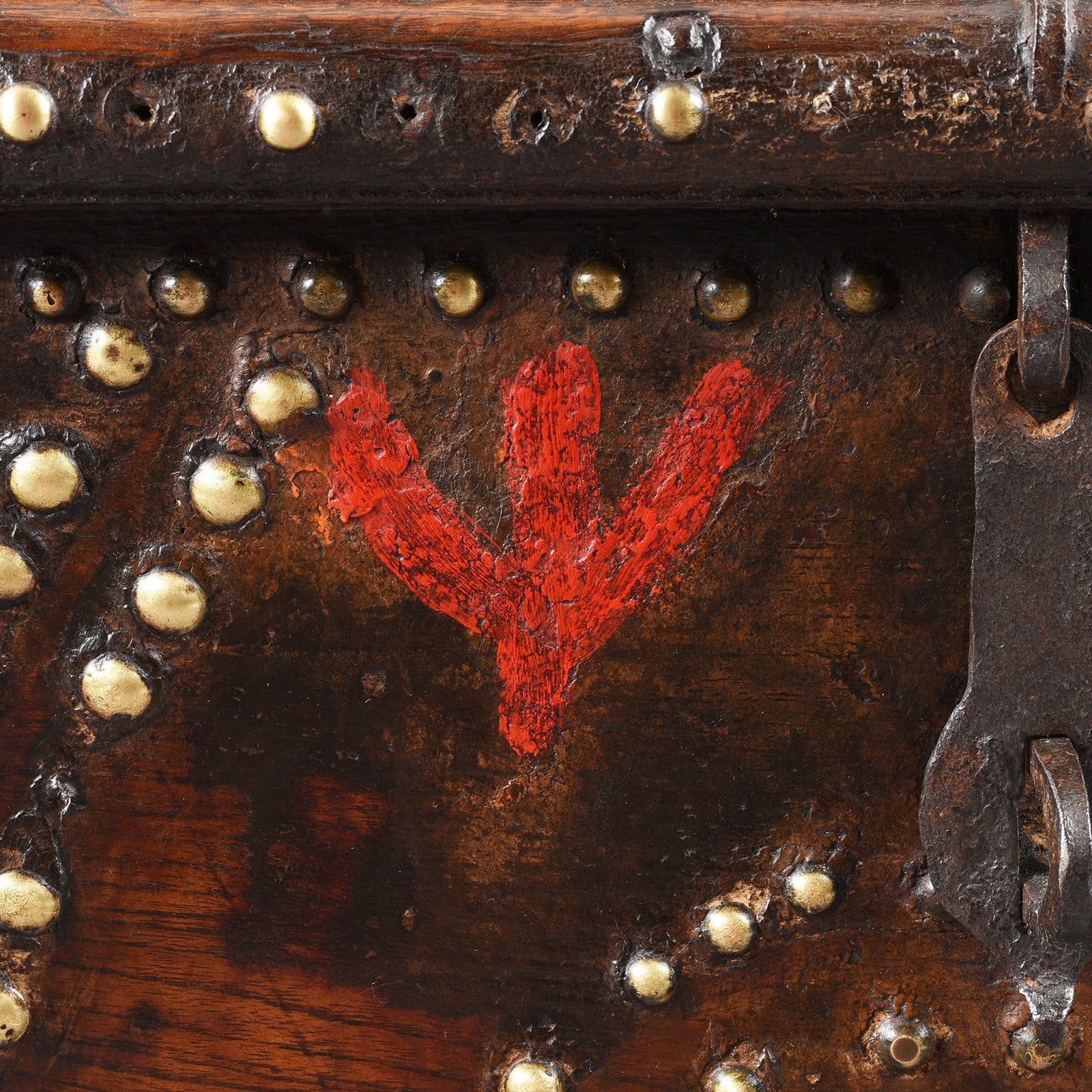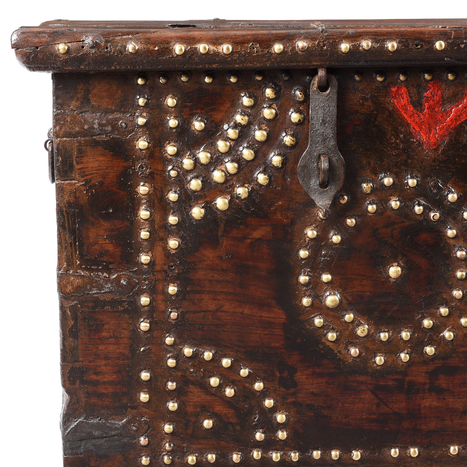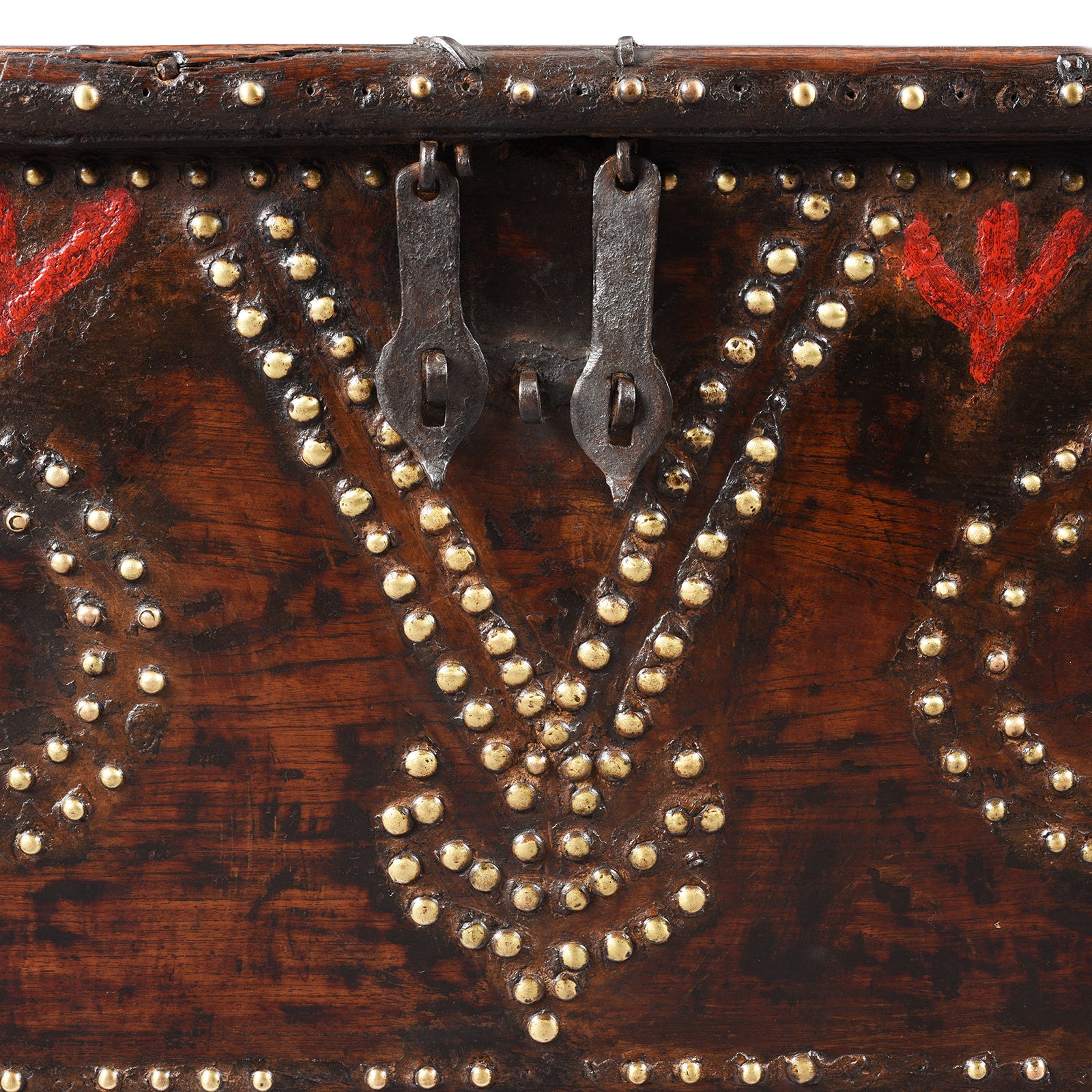 The chest is decorated with brass studs and corners. It has brass lifting handles on the sides. As a trading chest, this piece has had a tough life and has had various repairs during its lifetime. It has retained its interior candle box.
