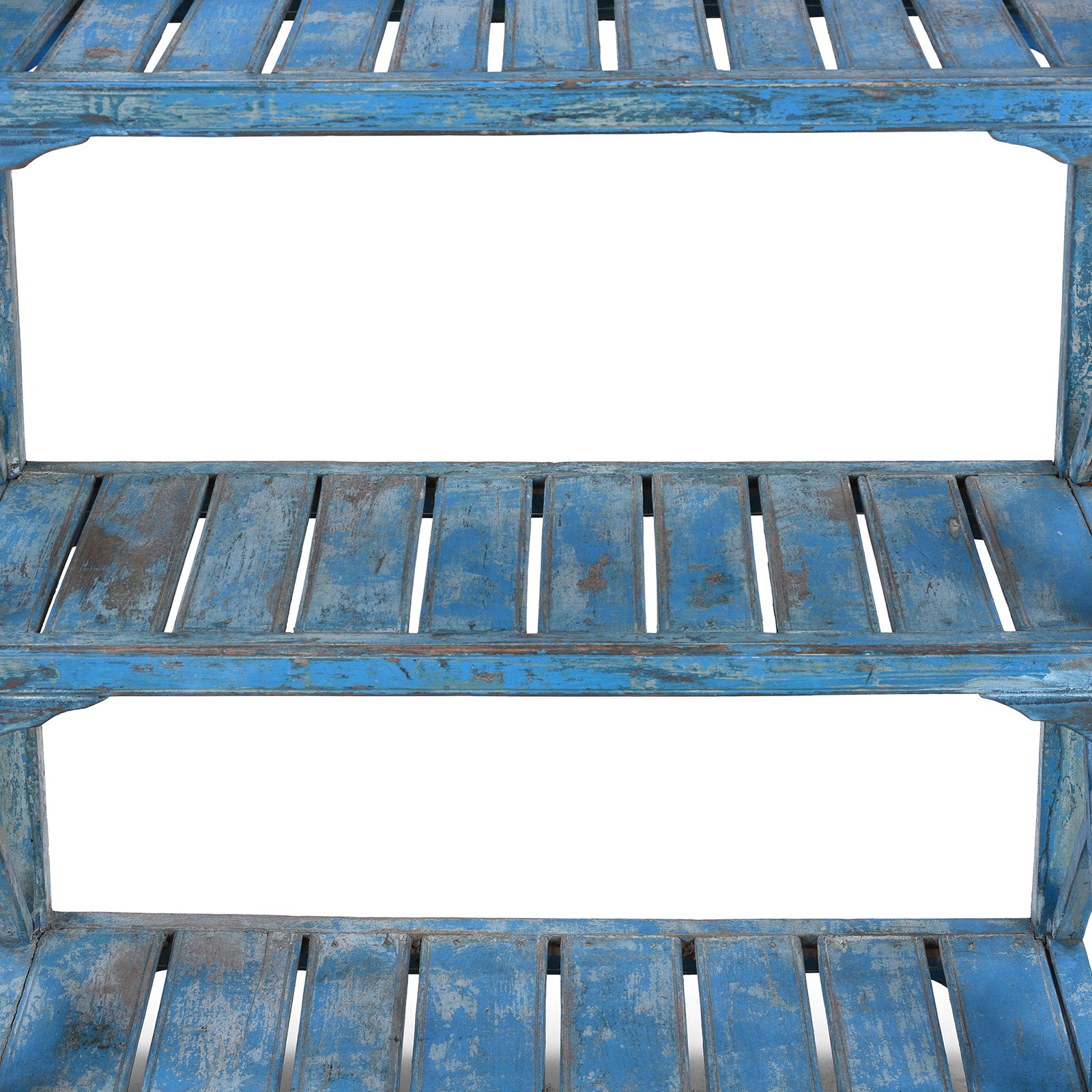 The open three-tier form features slatted shelves, allowing for airflow and lending the piece a lighter, more relaxed appearance. Cross-braced sides provide both structural strength and a pleasing architectural rhythm, while the simple turned finials at the top corners add a restrained decorative touch. The shaped apron beneath each shelf introduces a subtle softness to the otherwise linear frame. Approaching a century in age, the shelf remains sturdy and reliable — a testament to the enduring quality of teak and traditional craftsmanship. Its bold yet weathered blue finish makes it particularly well suited to coastal, country or eclectic interiors.
