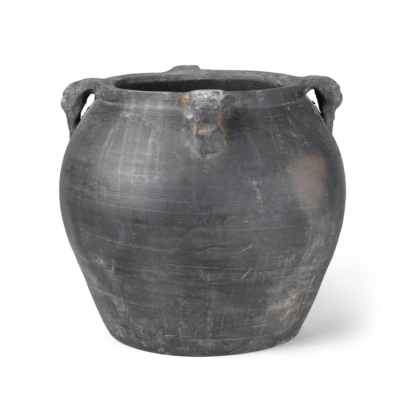 This rustic Chinese storage jar dates to the 19th century and originates from Shanxi province in northern China. Rich in earthy grey and charcoal tones, the surface has a beautifully weathered, wabi-sabi quality that reflects decades of use and natural ageing. The jar is hand-thrown, with visible throwing lines and a softly rounded form that speaks to its utilitarian origins.