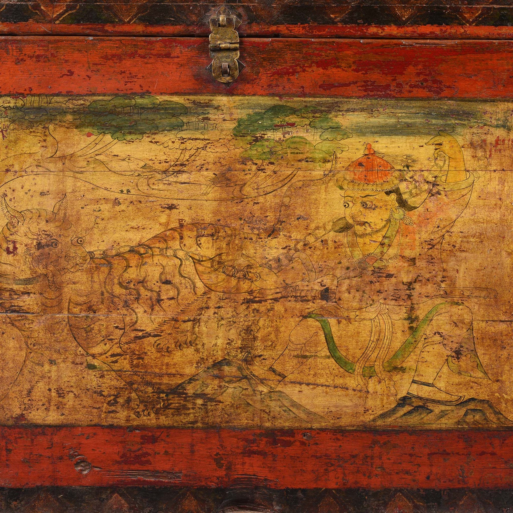 This 18th century wooden Tibetan chest depicts a classic scene of a Mongol holding a chained tiger. During his reign, Güsh Khaan (1582 €“ 14 January 1655), the descendant of Qasar (the younger brother of Genghis Khan) conquered much of Tibet.