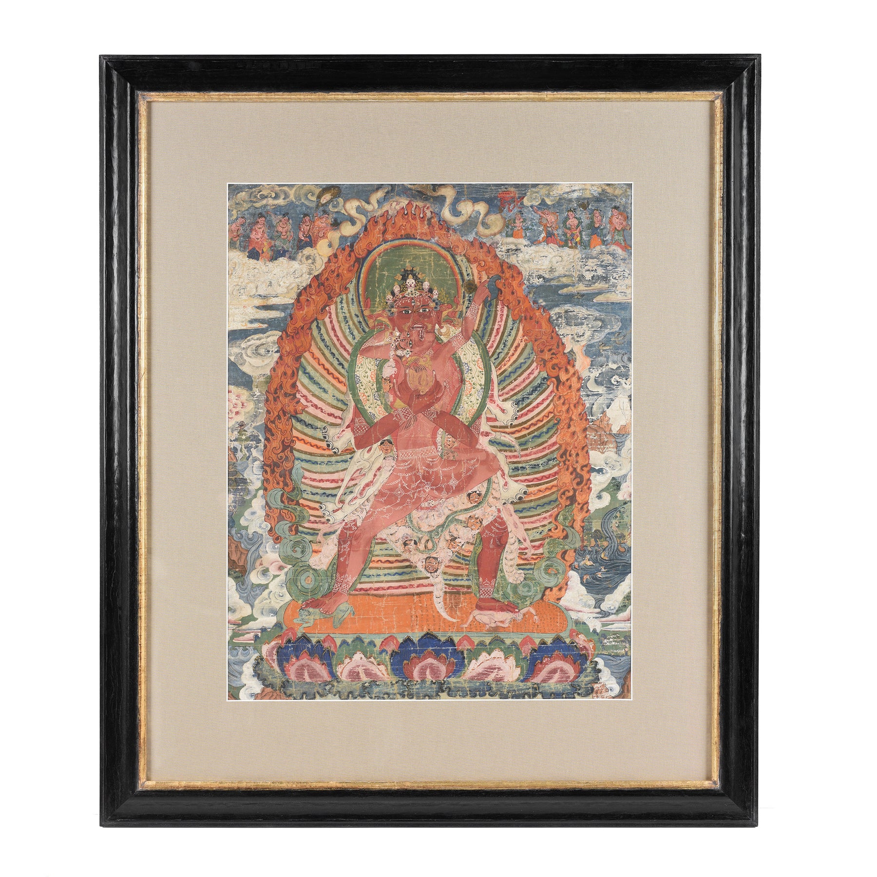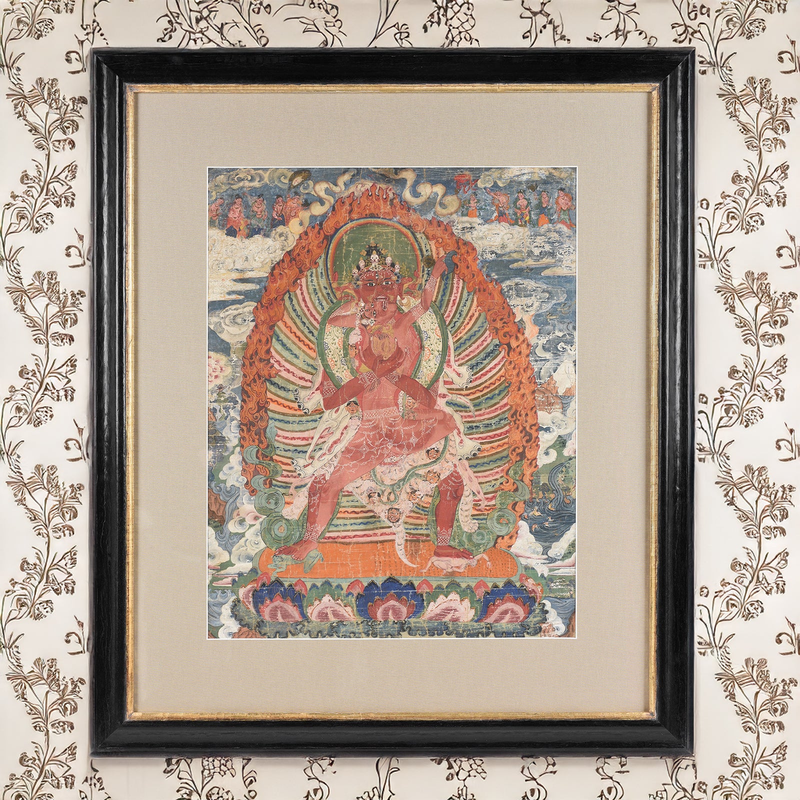This old Tibetan thangka depicts Raktayamari embracing his consort Vajravetali in the yab-yum pose. This pose represents the unity of male compassion and female wisdom, essential for achieving enlightenment. Raktayamari is a a deity known as a yidam who presides over the great tantras, and subdues death and inner delusions.