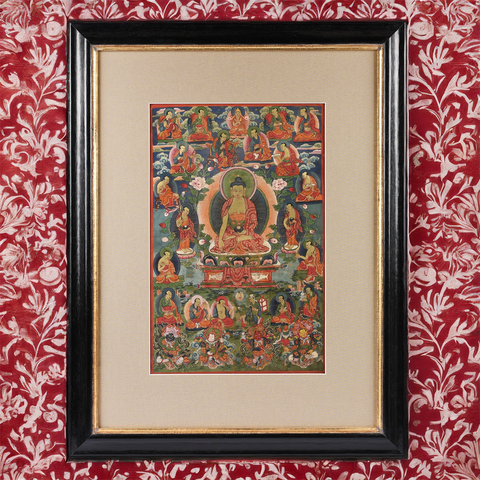 This beautifully painted Tibetan Thangka was painted with the Shakyamuni buddha seated in the center, his right hand is extended in Bhumisparsha mudra, his left in Samadhi mudra and supporting an urn Dating from the late 19th century.