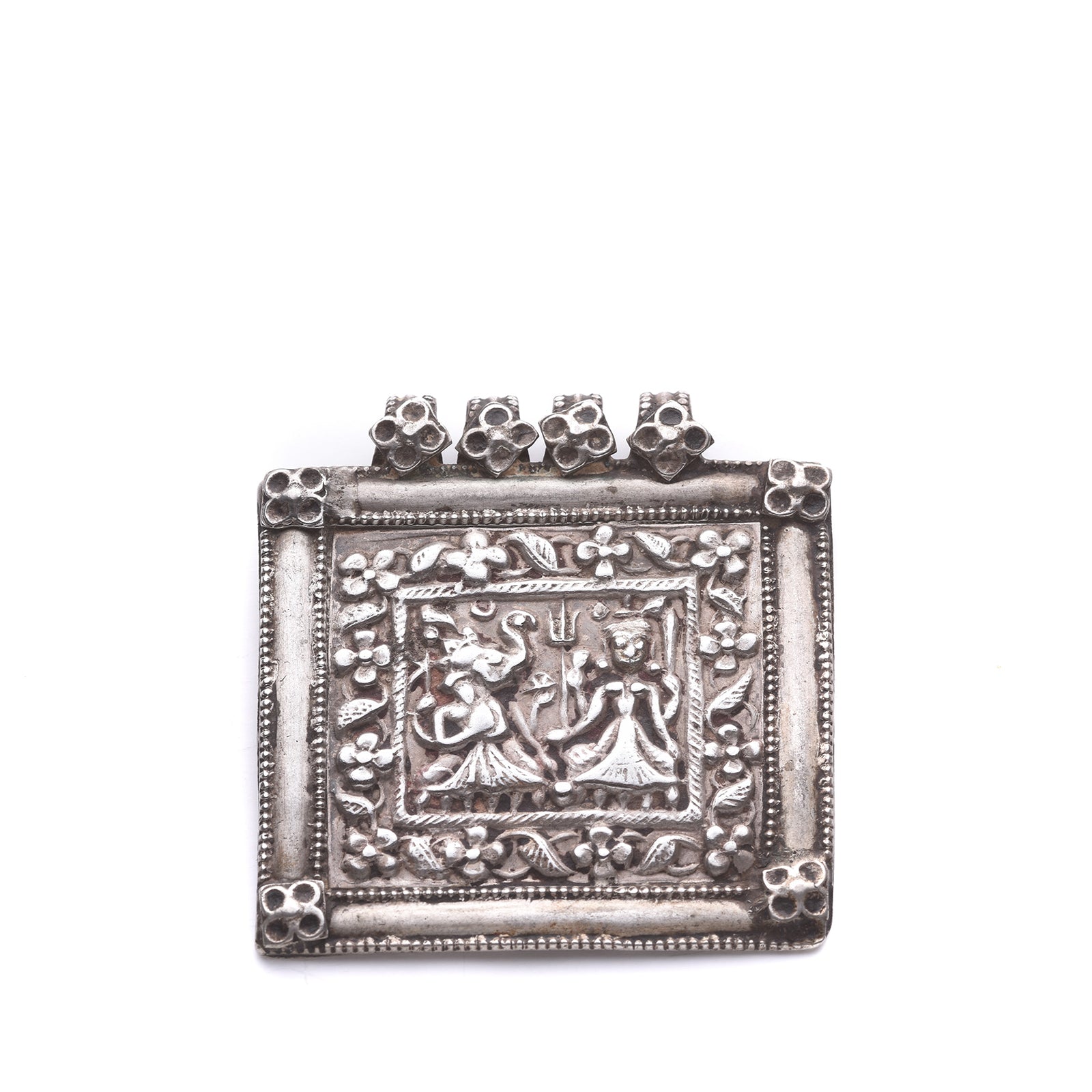 This 19th century silver kanchha amulet from Rajasthan brings together Ganesh and Lakshmi, a pairing long favoured across the region for its combined promise of prosperity, wellbeing and the removal of obstacles. The two deities sit in a compact rectangular, shrine-like panel framed by a dense mandaliya-style border of flowers and beadwork, forming a small portable vastu or sacred house-plan. Its four flower-shaped terminals conceal the suspension loops, where a cord or woollen thread would once have been passed so the amulet could be worn openly on the chest during daily life, work and travel.