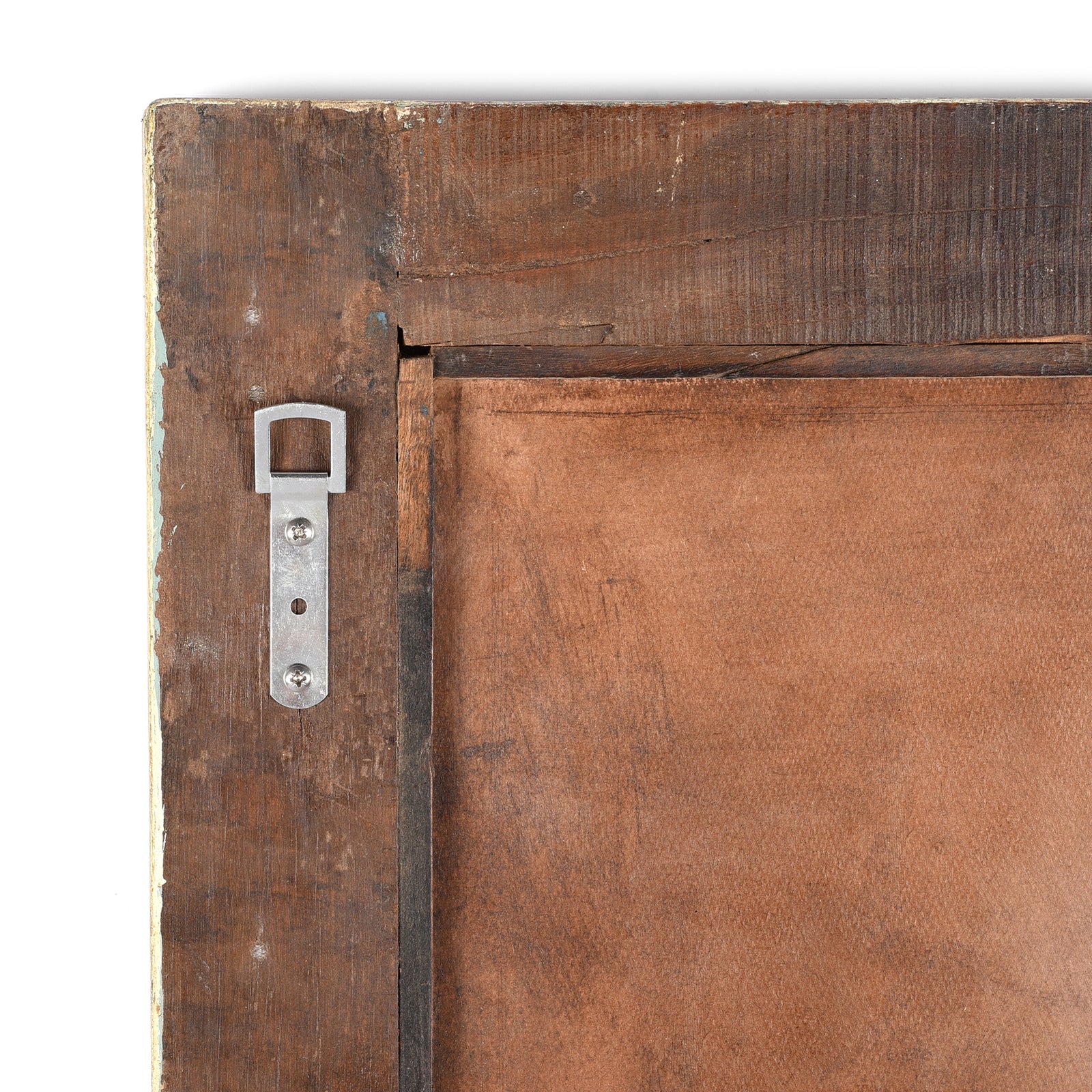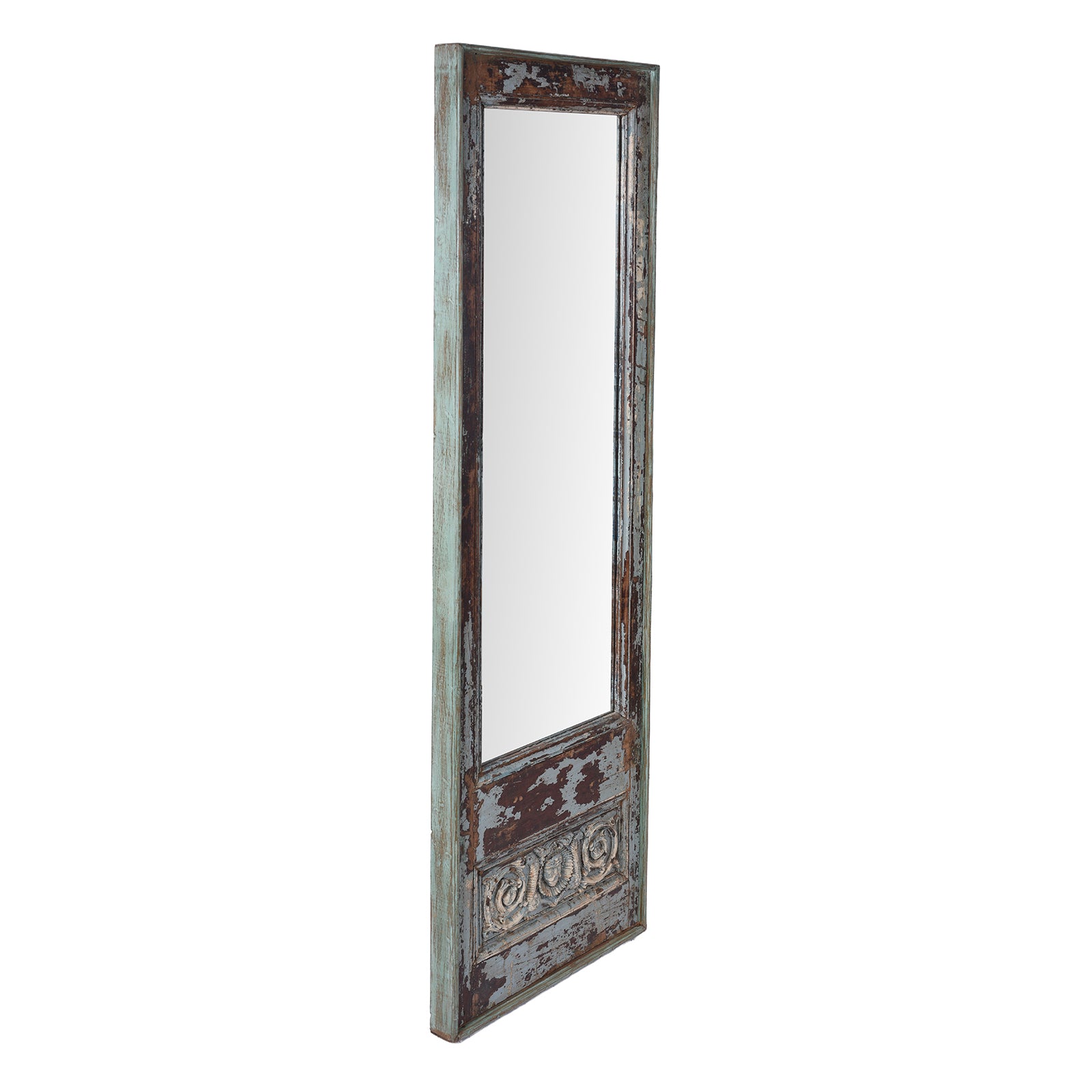 The weathered blue and brown paintwork reveals generations of layered colour and wear, creating a beautifully aged surface. The lower panel is intricately carved with scrolling foliate motifs surrounding a moustached face, an auspicious symbol sometimes used in Rajasthani & Gujarati architecture to protect the home. Crafted from reclaimed architectural teak, this mirror is not only rich in history but also an environmentally responsible choice.