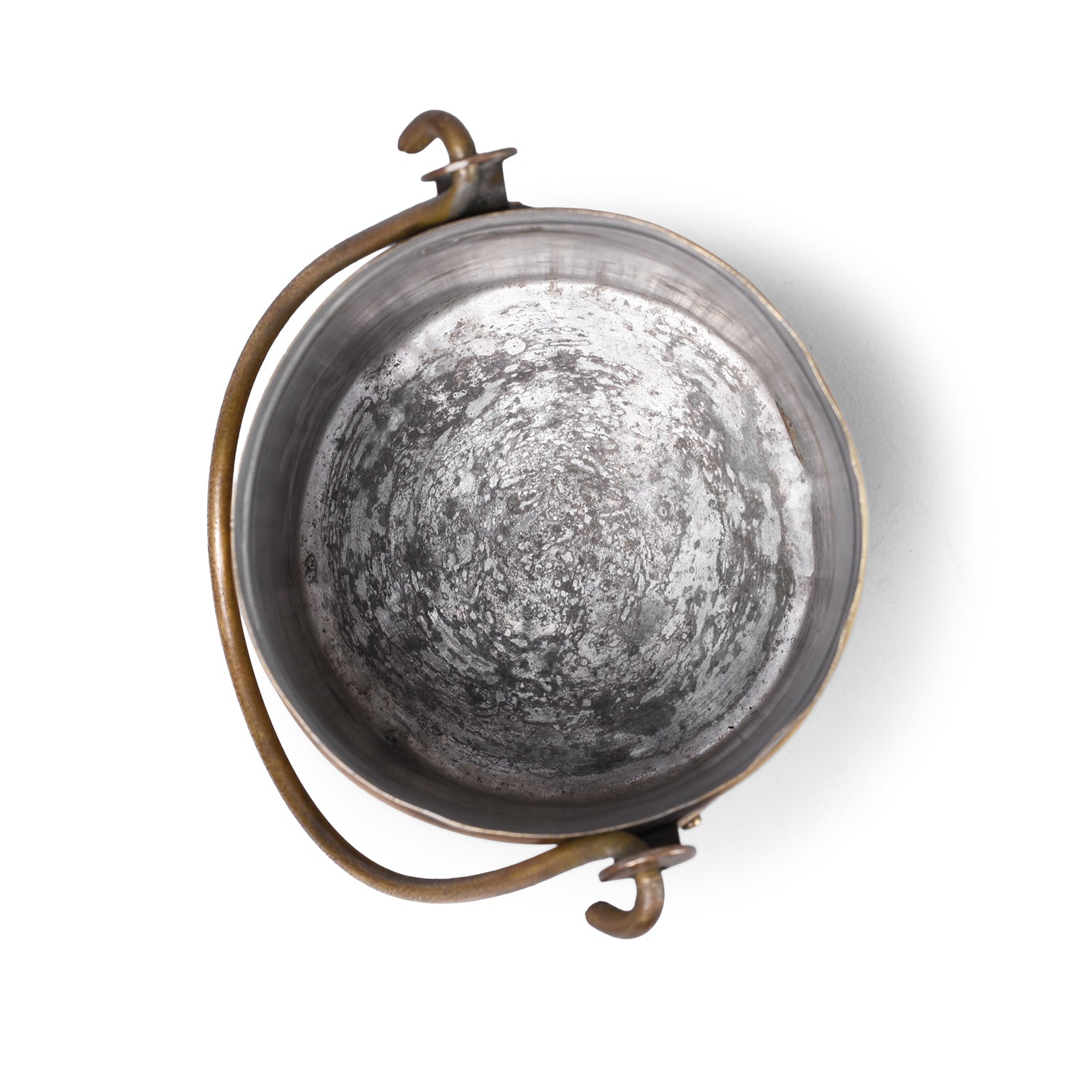What sets these examples apart are their long looped handles, designed to make them easier to carry or suspend. The simple lift-off lids, each fitted with a ring pull, add to their functional charm. With their understated form and timeworn character, they embody the essence of Indian domestic brassware€”objects created for everyday utility that now carry a decorative presence. Perfect for display in a kitchen, they can be used as storage vessels or purely as statement pieces.
