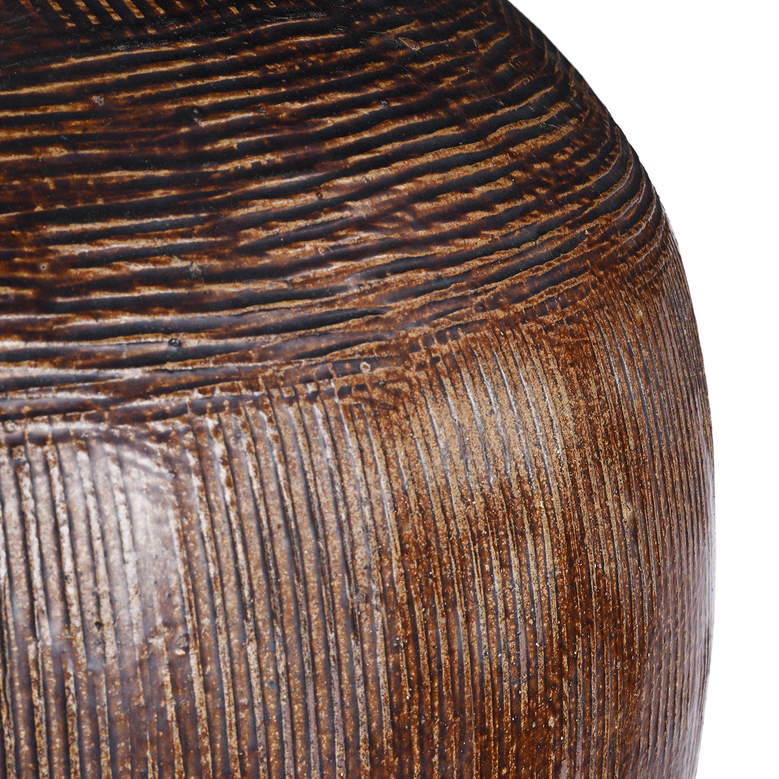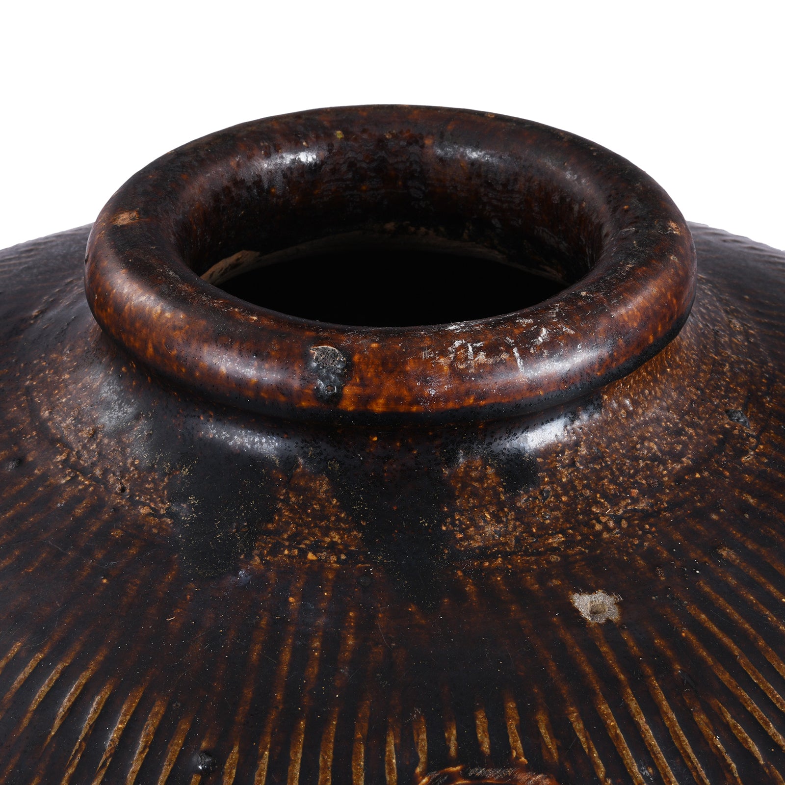 This exquisite old Chinese wine storage jar is incredibly decorative and can be placed both indoors or outside. Covered in a rich brown glaze and scored with linear patterns, this is a wonderfully decorative piece with a functional past.