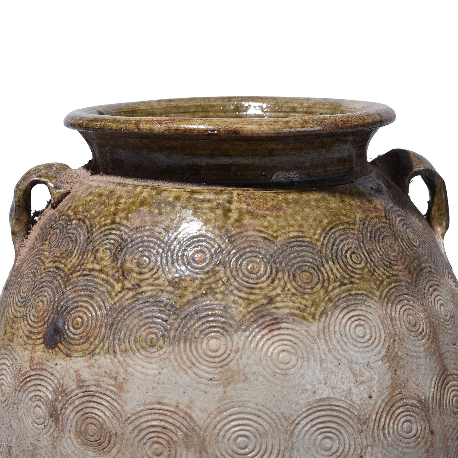 - Features: Incised Spiral Decoration, Lug Handles, Mottled Natural Glaze