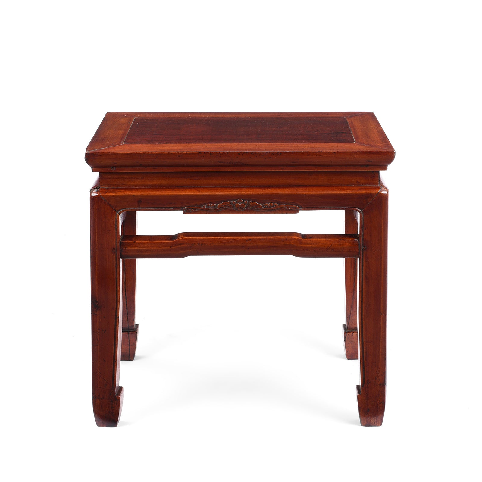 This vintage table is constructed from a cypress wood (Bǎimù 柏木) frame with a rosewood (huali 花梨) central panel. This style of table would have been used as stools or side tables and has been produced in China since the Ming dynasty.