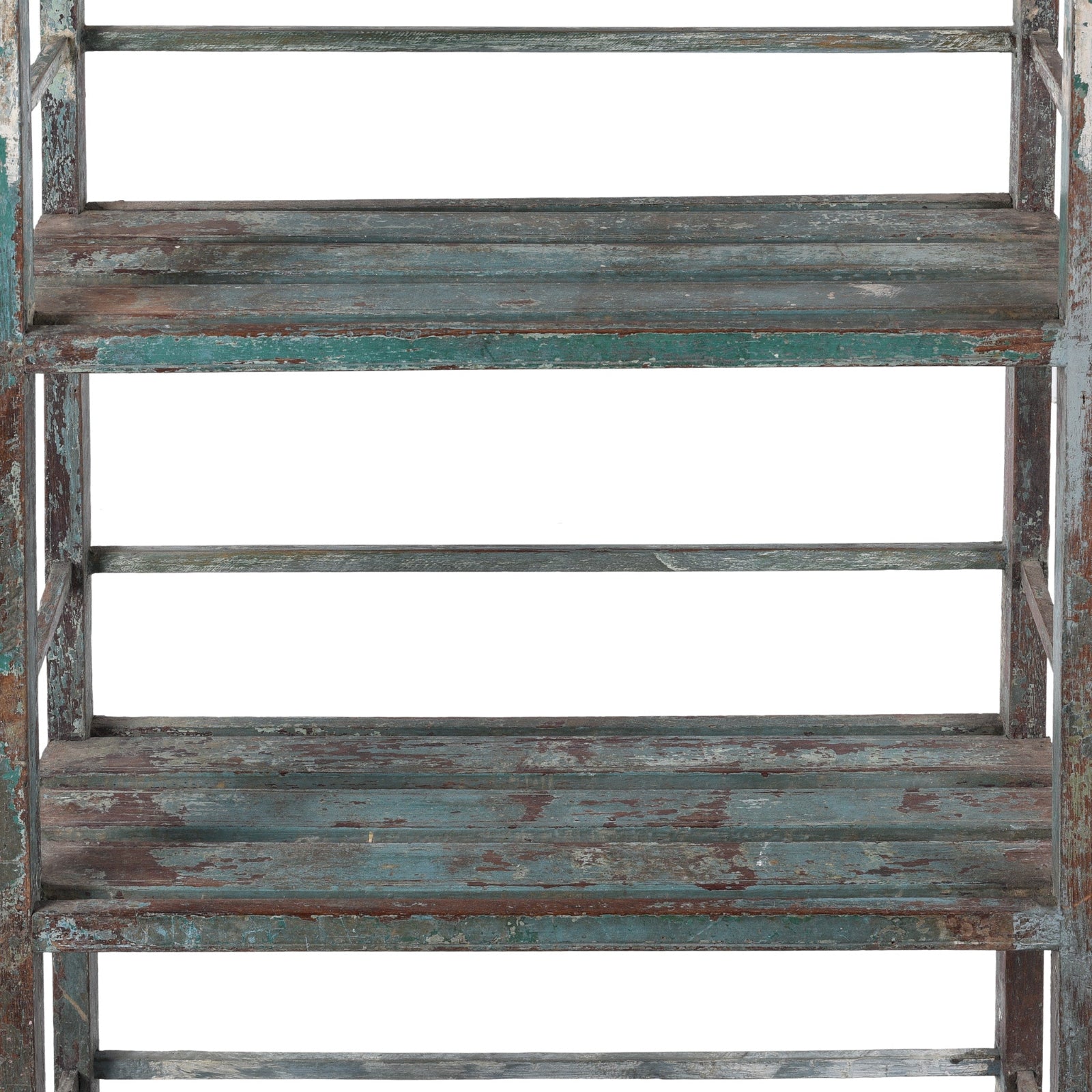 This striking Anglo- Indian teak shelf dates from the days of the Raj, circa 1920's. It brings rustic charm and timeworn beauty to any interior, showing the remains of its original paint in greens and blues. The piece features four open tiers, each framed by slender slats and weathered surfaces that reveal layers of aged patina. At nearly one hundred years old, it's still a very sturdy and reliable piece. Its tall, narrow form makes it ideal for showcasing textiles, pottery, or curated curios in a living room, bathroom, or hallway, fitting perfectly into a wide range of interior styles