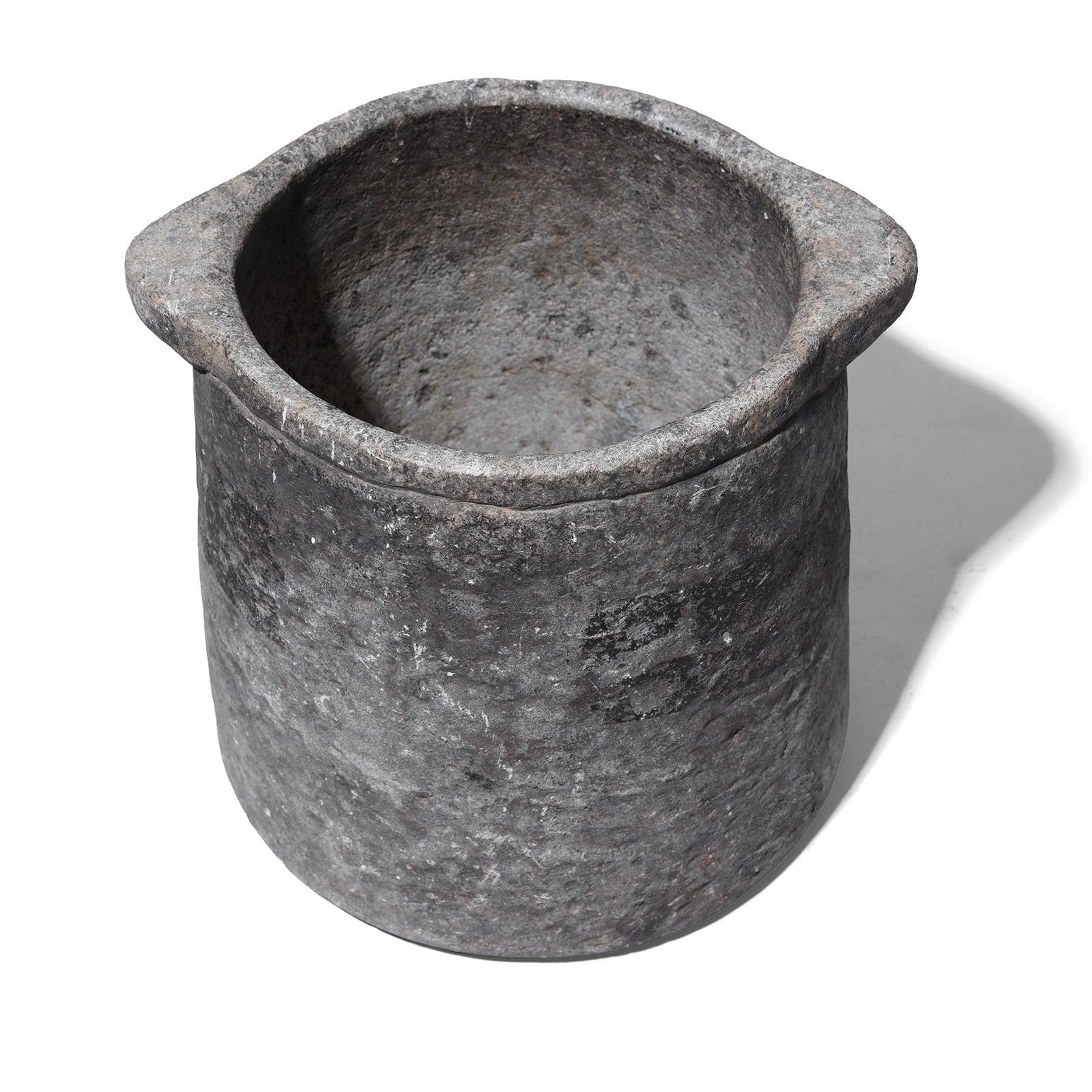 This early 20th-century carved-stone pot was originally used in South Indian and tribal communal kitchens, where thick-walled vessels were prized for their durability and excellent heat retention. Hand-carved from a single block of dense stone, it would have served as a hardworking cooking vessel for boiling rice, reducing milk, preparing kanji (a traditional porridge), or slowly simmering lentils and grains over a clay-lined chulha hearth. Its subtly rounded base, wide mouth, and deeply worn interior all speak to many years of continuous, practical use.