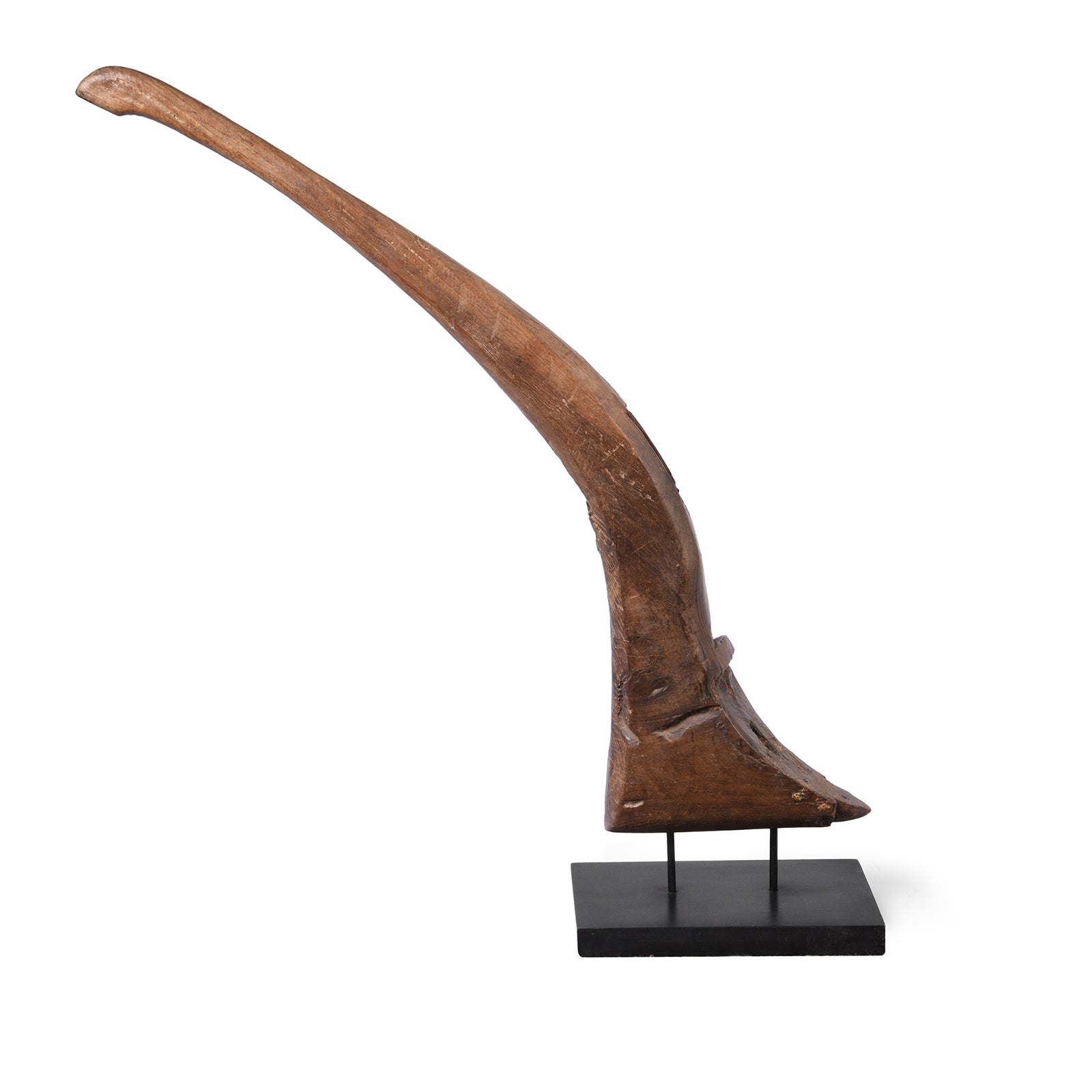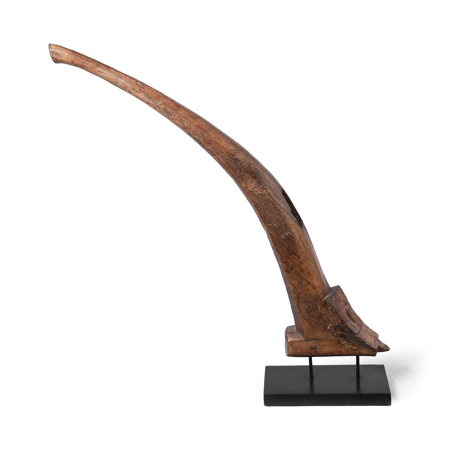 These old oxen plough handles from Indonesia have been mounted on a modern stand to create unique decorative pieces. Each handle was once part of a working agricultural tool, used for guiding a wooden plough behind a team of oxen. Decades of use have given the hardwood a rich patina, highlighting the smooth curves and functional shaping that evolved through long practical use.