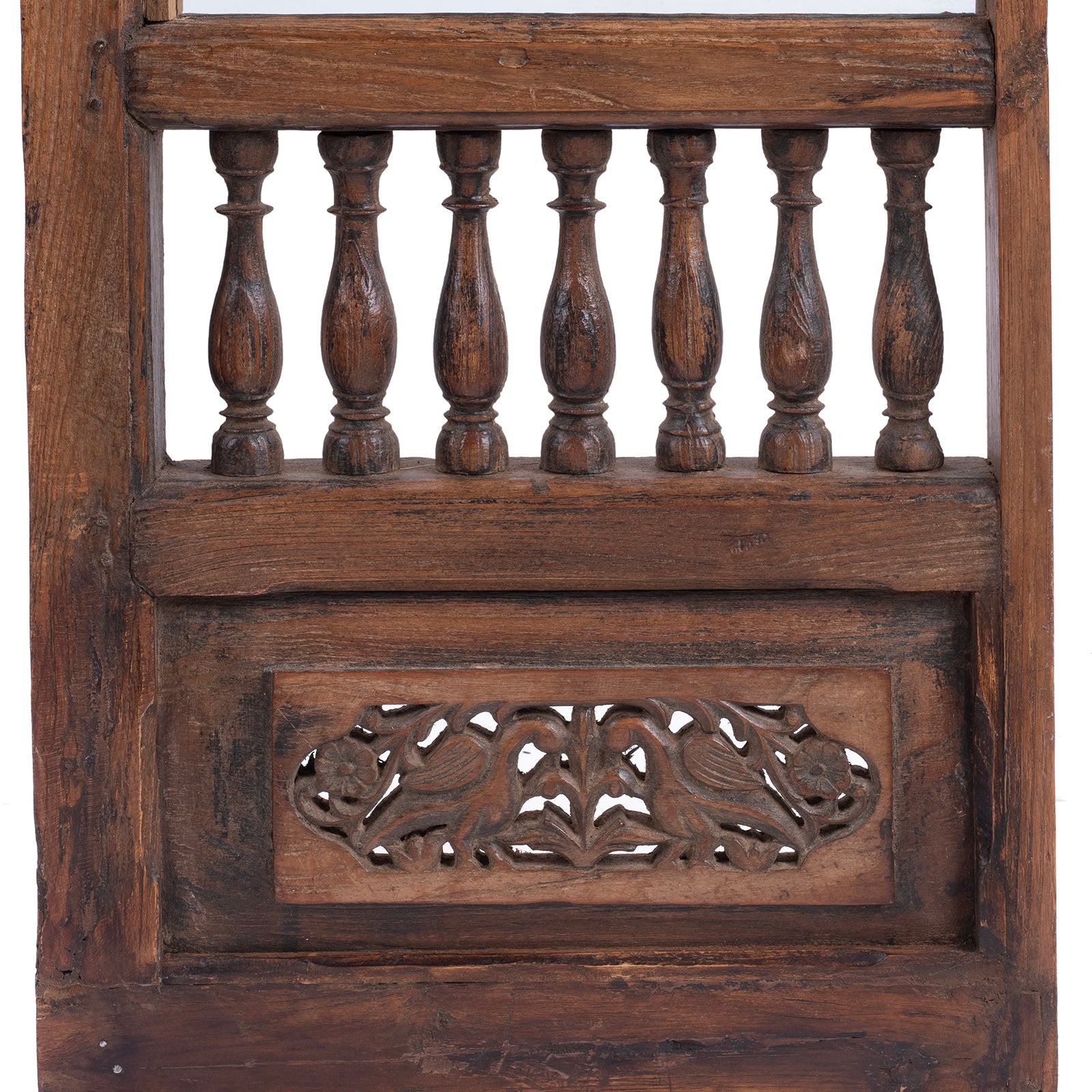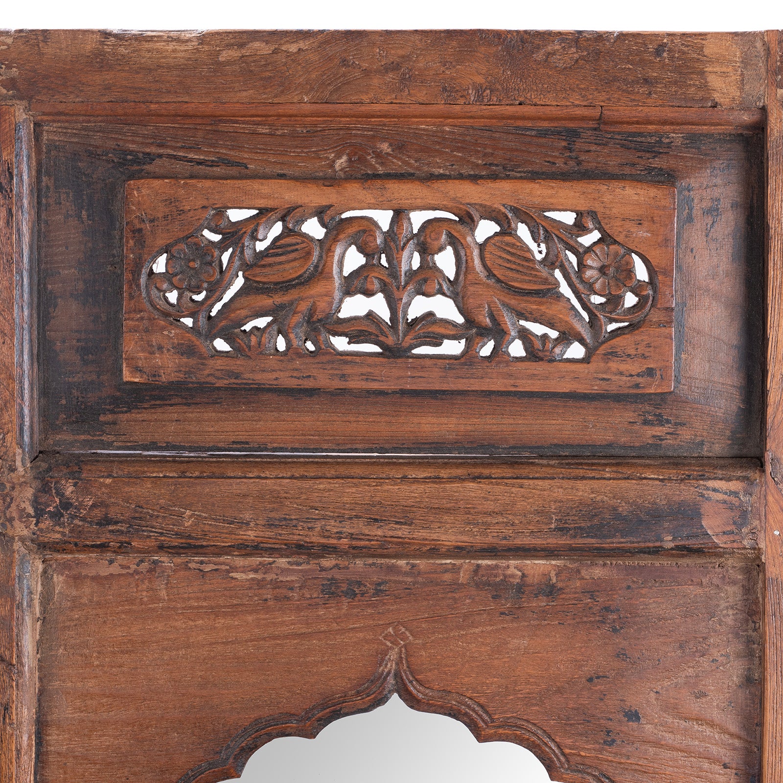 This beautiful mirror is crafted from an old 19th-century Indian balcony from Hyderabad. The top and bottom panels have beautifully carved peacocks and a Mughal mihrab arch framing the main body of the mirror. There is also stylized peacock detailing at the base of the arch which adds character to an already unique piece that would look great in a living room or bedroom.