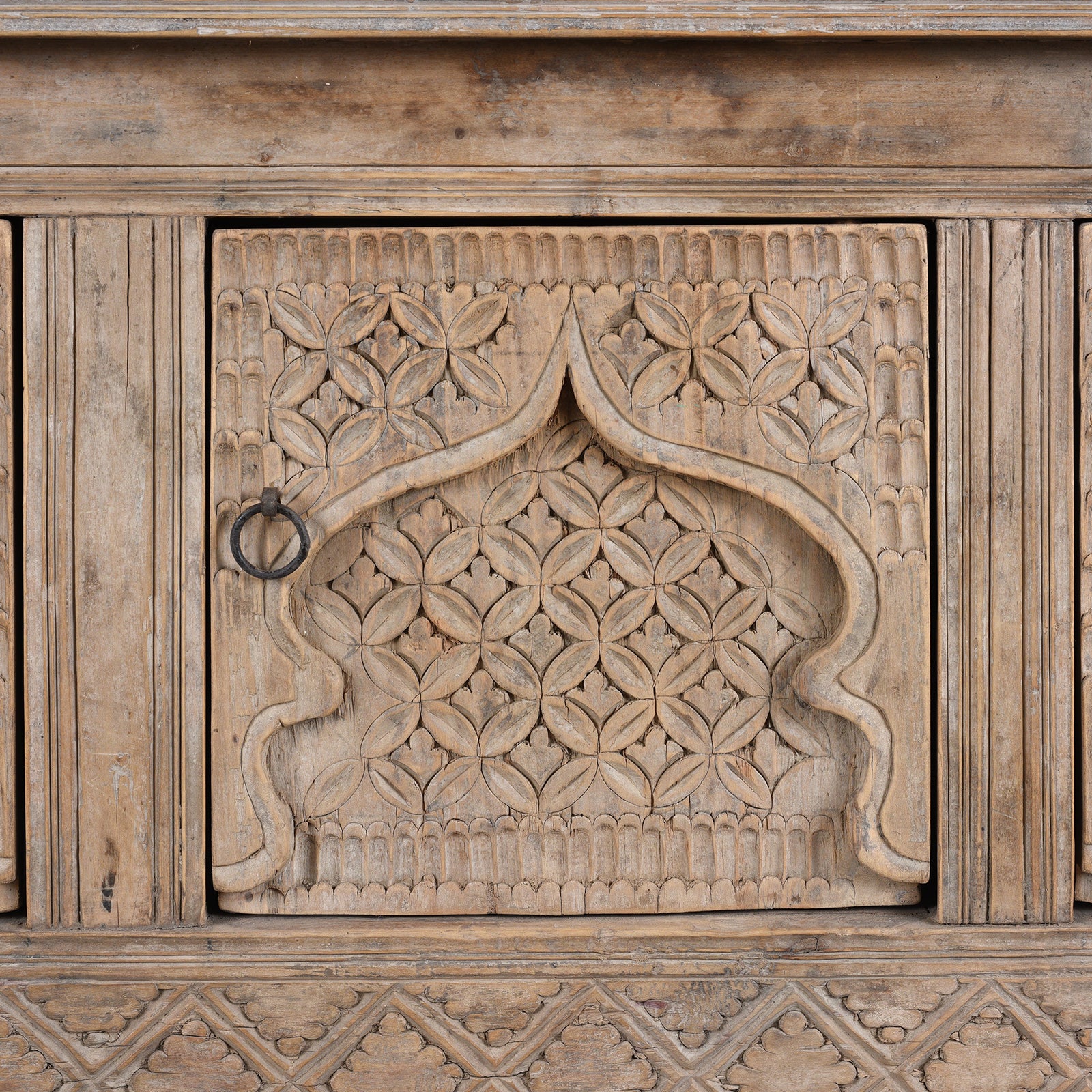 Mughal Arch Door Panel Carving Detail From Bleached Hardwood Sideboard From Xinjiang China With Intricately Carved Moorish Arch Panels Converted From Antique Daybed Late 19Th Century