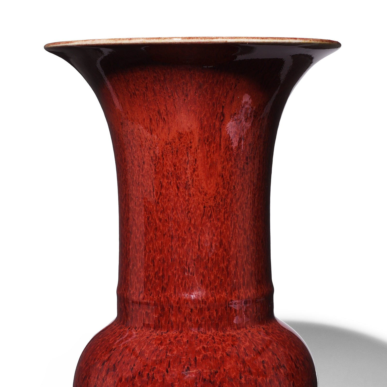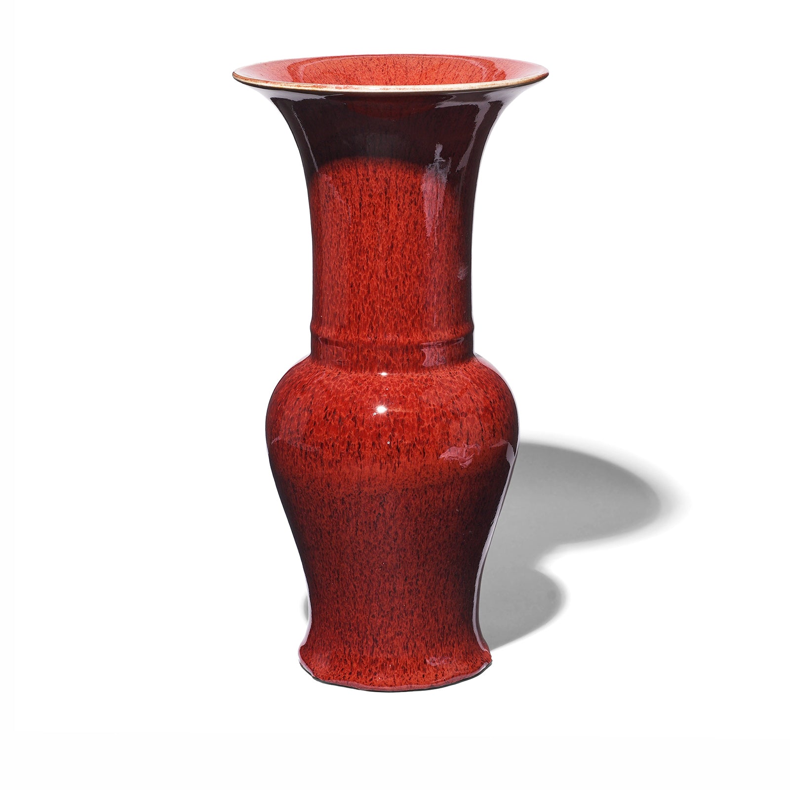 This beautifully rich & glossy dark red flambé vase is a Chinese reproduction piece made in Jingdezhen in the traditional way by hand.