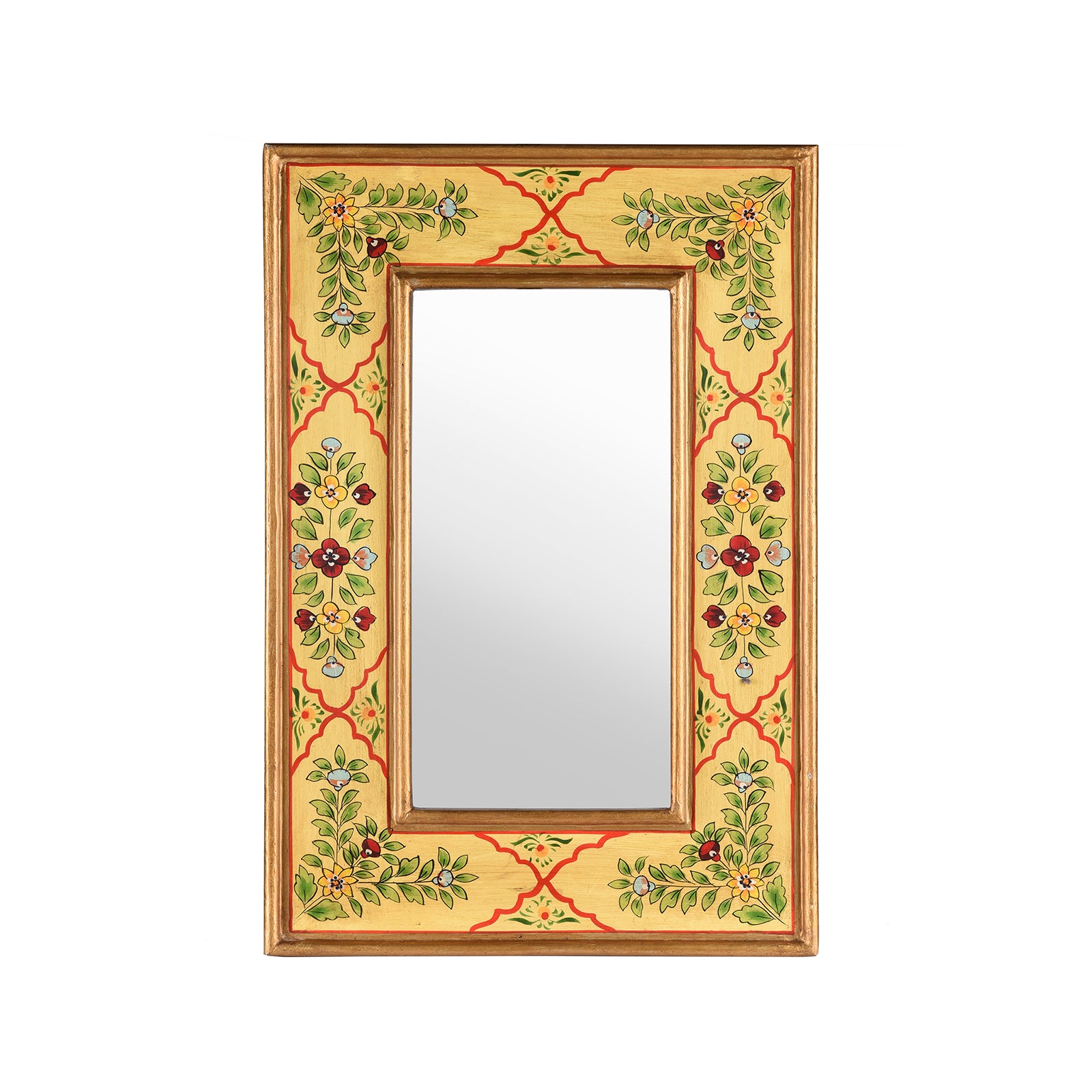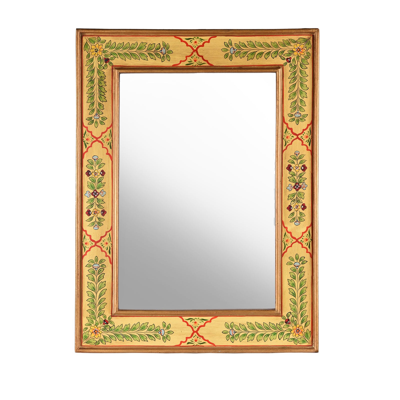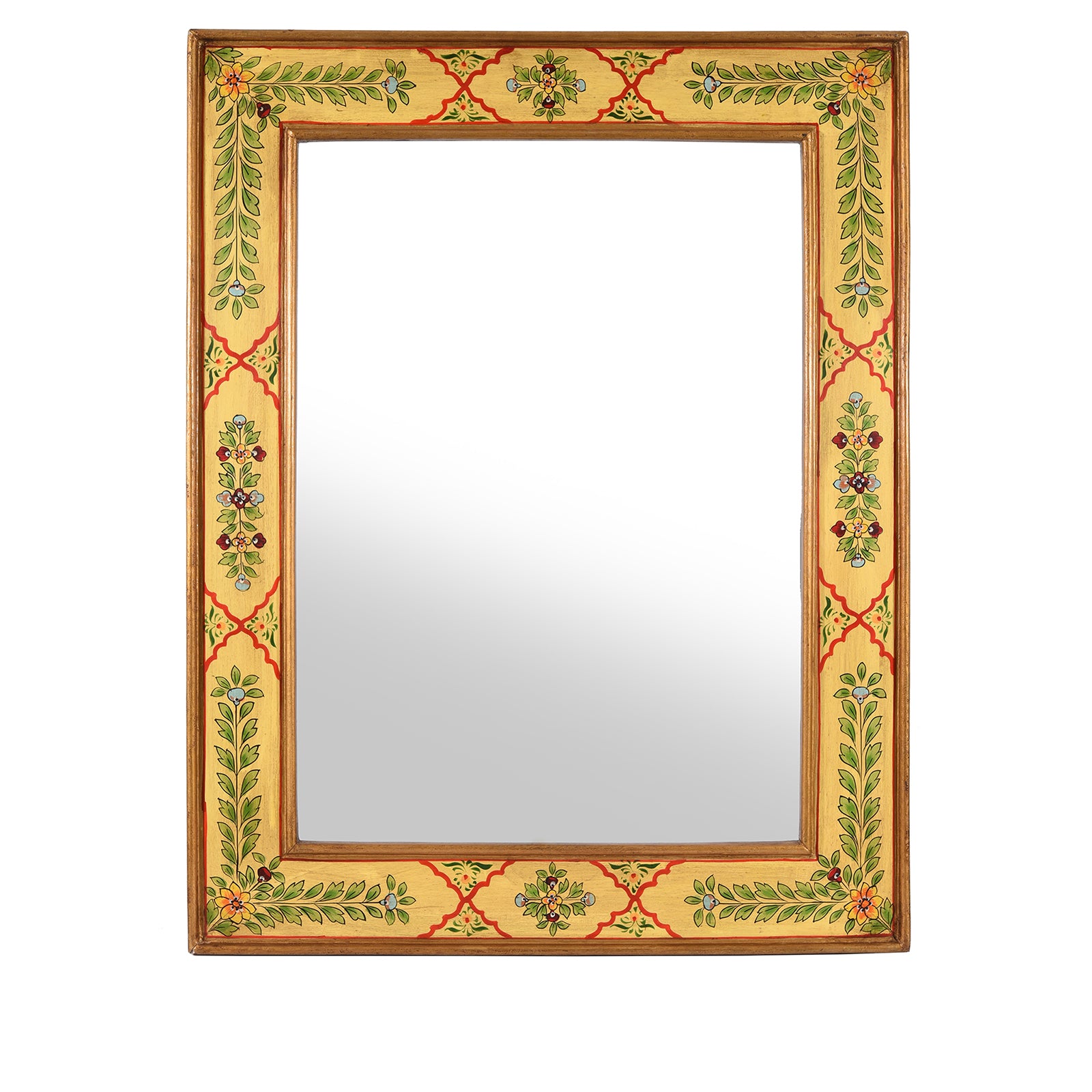This hand painted Indian mirror is decorated in a sumptuous Rajasthani yellow tone and is a luxurious addition to any home. Crafted from wood and thoughtfully designed to add an elegant touch to your space, this mirror blends traditional Rajasthani and Mughal designs. Elevate the décor of your living room or bathroom with this exclusive mirror.